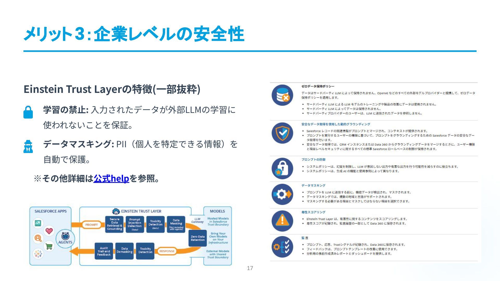 Cloudに蓄積されたリアルタ イムの顧客データ、メタデータ、フ ローを直接活⽤し、深い⽂脈を理 解します。 信頼と安全 Einstein Trust Layerにより、デー タのプライバシーとセキュリティを 確保しながら、正確なアクション を実現します。 5