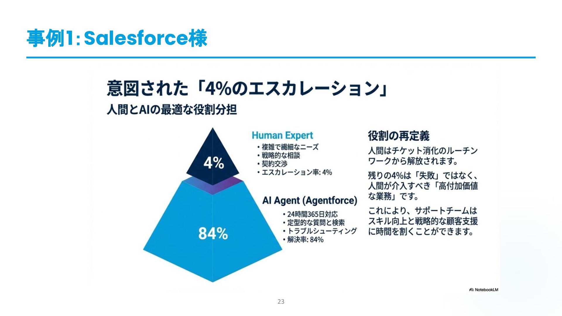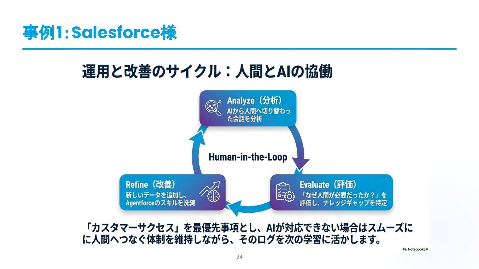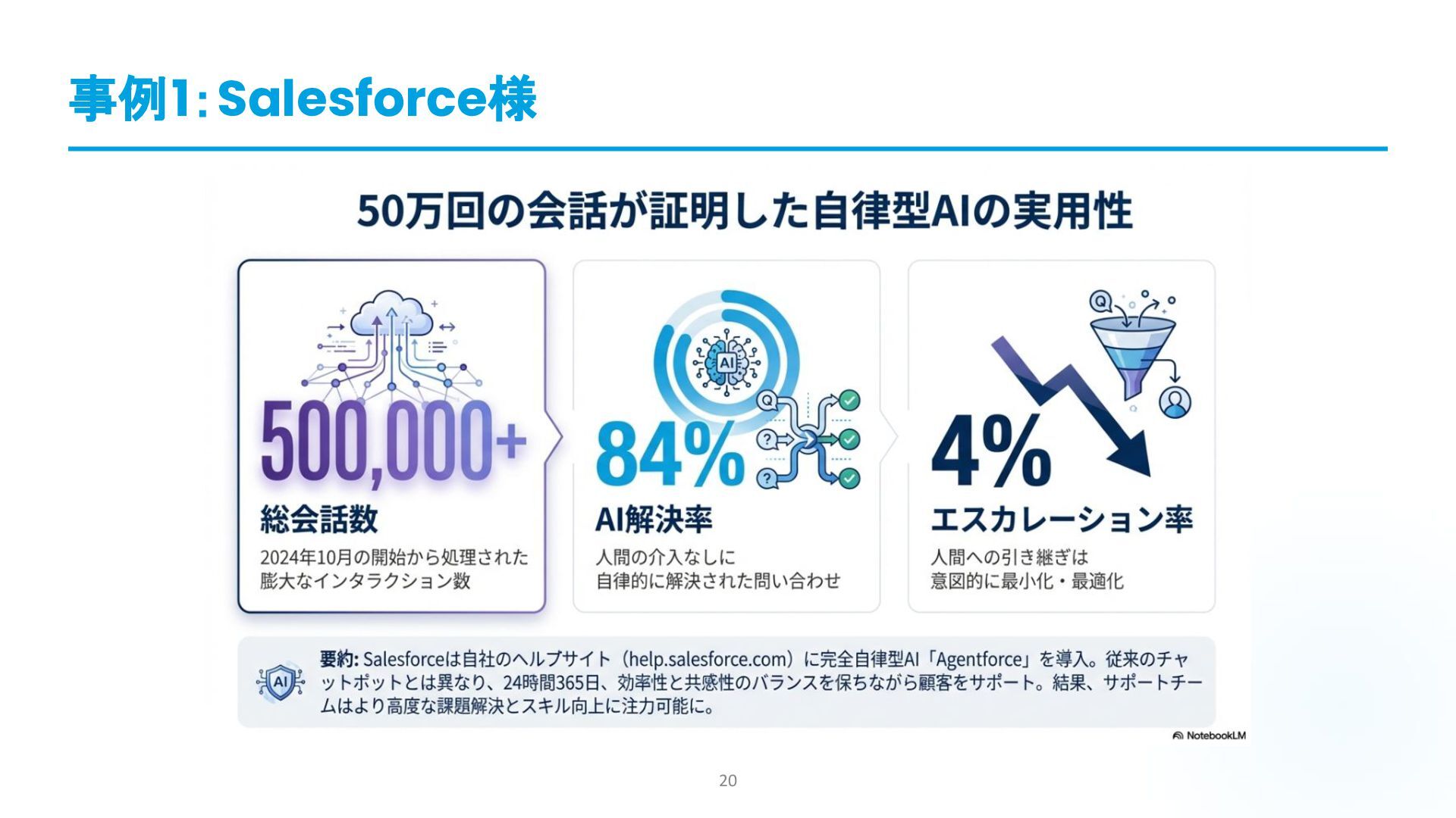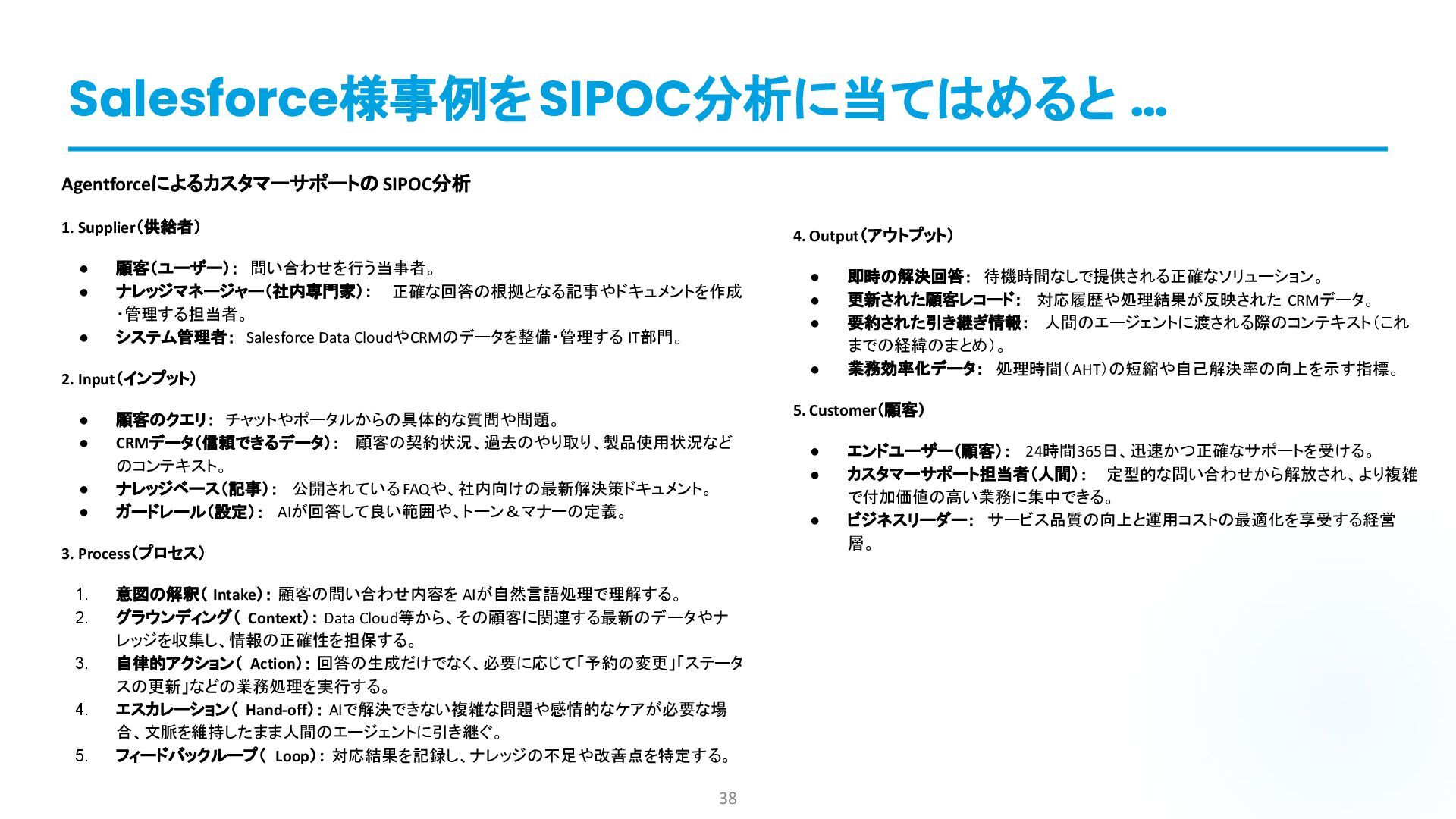 ナレッジマネージャー(社内専門家): 正確な回答の根拠となる記事やドキュメントを作成 ・管理する担当者。 • システム管理者: Salesforce Data CloudやCRMのデータを整備・管理する IT部門。 2. Input(インプット) • 顧客のクエリ: チャットやポータルからの具体的な質問や問題。 • CRMデータ(信頼できるデータ): 顧客の契約状況、過去のやり取り、製品使用状況など のコンテキスト。 • ナレッジベース(記事): 公開されているFAQや、社内向けの最新解決策ドキュメント。 • ガードレール(設定): AIが回答して良い範囲や、トーン&マナーの定義。 3. Process(プロセス) 1. 意図の解釈( Intake): 顧客の問い合わせ内容を AIが自然言語処理で理解する。 2. グラウンディング( Context): Data Cloud等から、その顧客に関連する最新のデータやナ レッジを収集し、情報の正確性を担保する。 3. 自律的アクション( Action): 回答の生成だけでなく、必要に応じて「予約の変更」「ステータ スの更新」などの業務処理を実行する。 4. エスカレーション( Hand-off): AIで解決できない複雑な問題や感情的なケアが必要な場 合、文脈を維持したまま人間のエージェントに引き継ぐ。 5. フィードバックループ( Loop): 対応結果を記録し、ナレッジの不足や改善点を特定する。 4. Output(アウトプット) • 即時の解決回答: 待機時間なしで提供される正確なソリューション。 • 更新された顧客レコード: 対応履歴や処理結果が反映された CRMデータ。 • 要約された引き継ぎ情報: 人間のエージェントに渡される際のコンテキスト(これ までの経緯のまとめ)。 • 業務効率化データ: 処理時間(AHT)の短縮や自己解決率の向上を示す指標。 5. Customer(顧客) • エンドユーザー(顧客): 24時間365日、迅速かつ正確なサポートを受ける。 • カスタマーサポート担当者(人間): 定型的な問い合わせから解放され、より複雑 で付加価値の高い業務に集中できる。 • ビジネスリーダー: サービス品質の向上と運用コストの最適化を享受する経営 層。 38