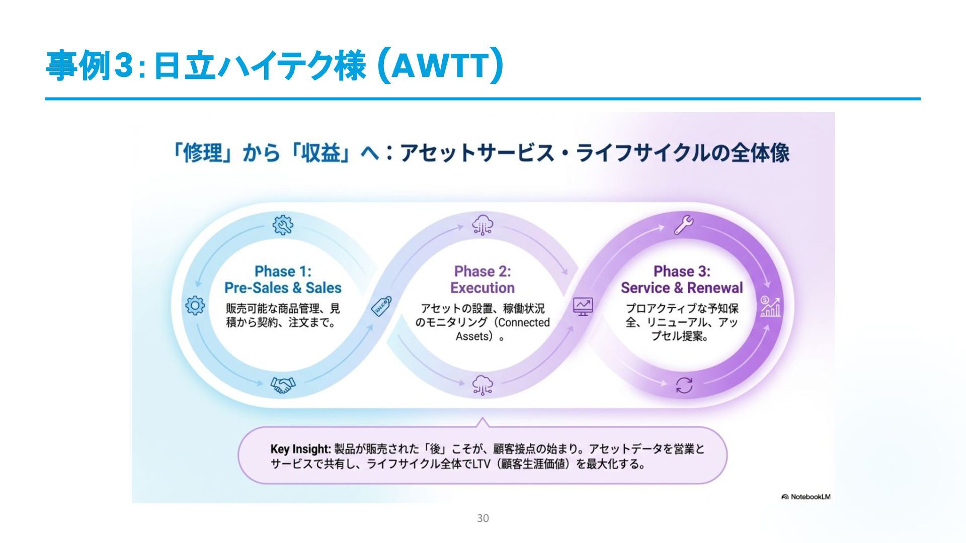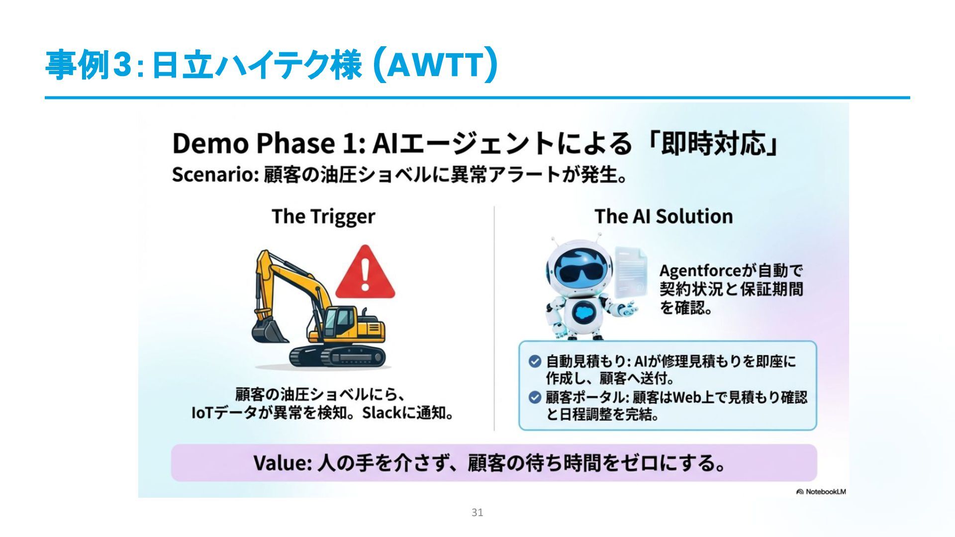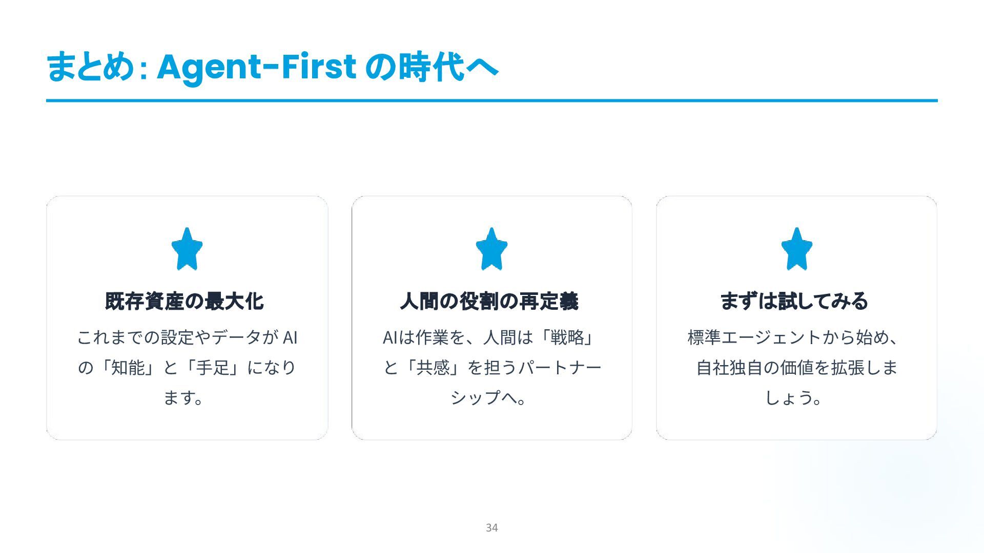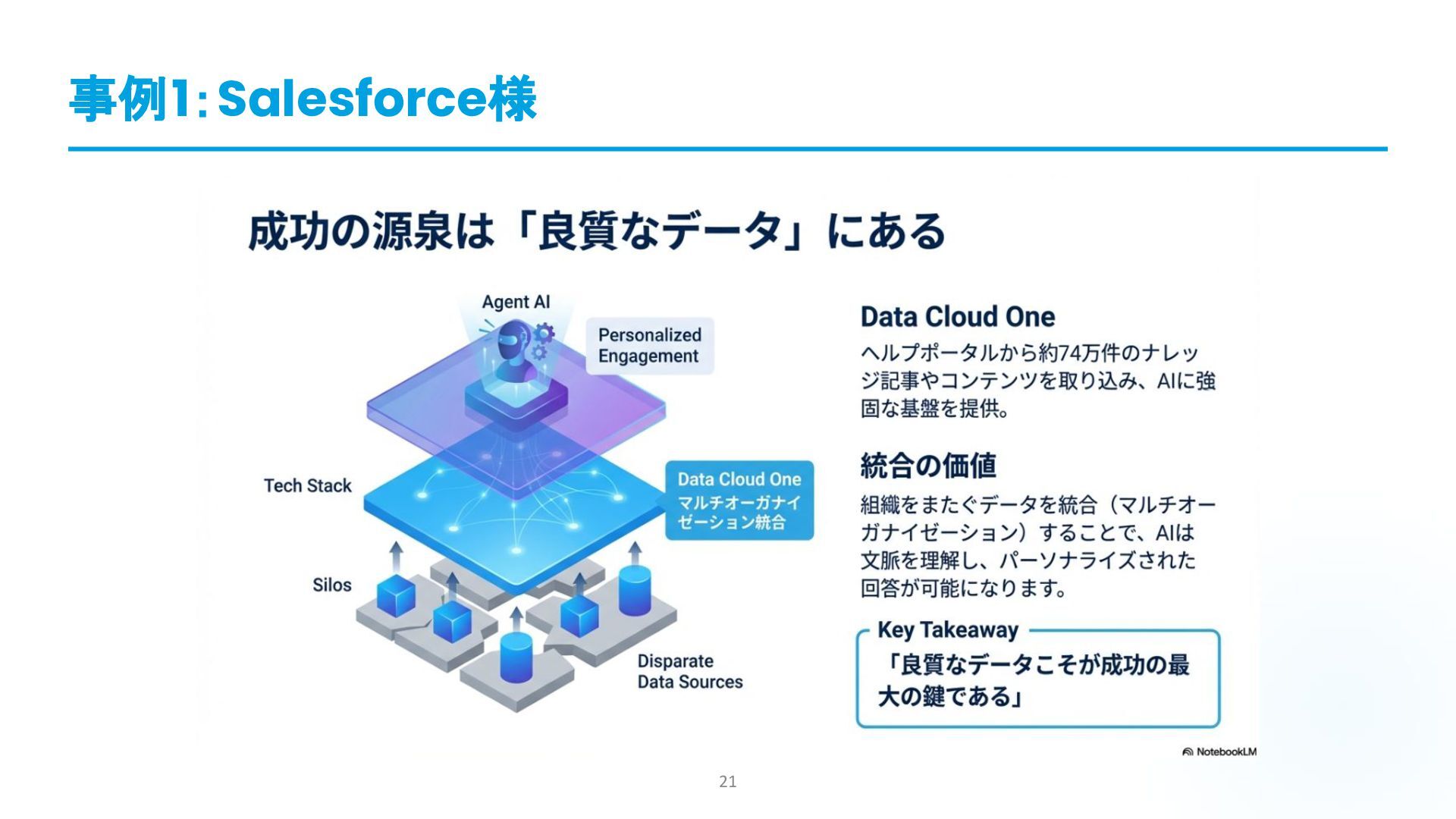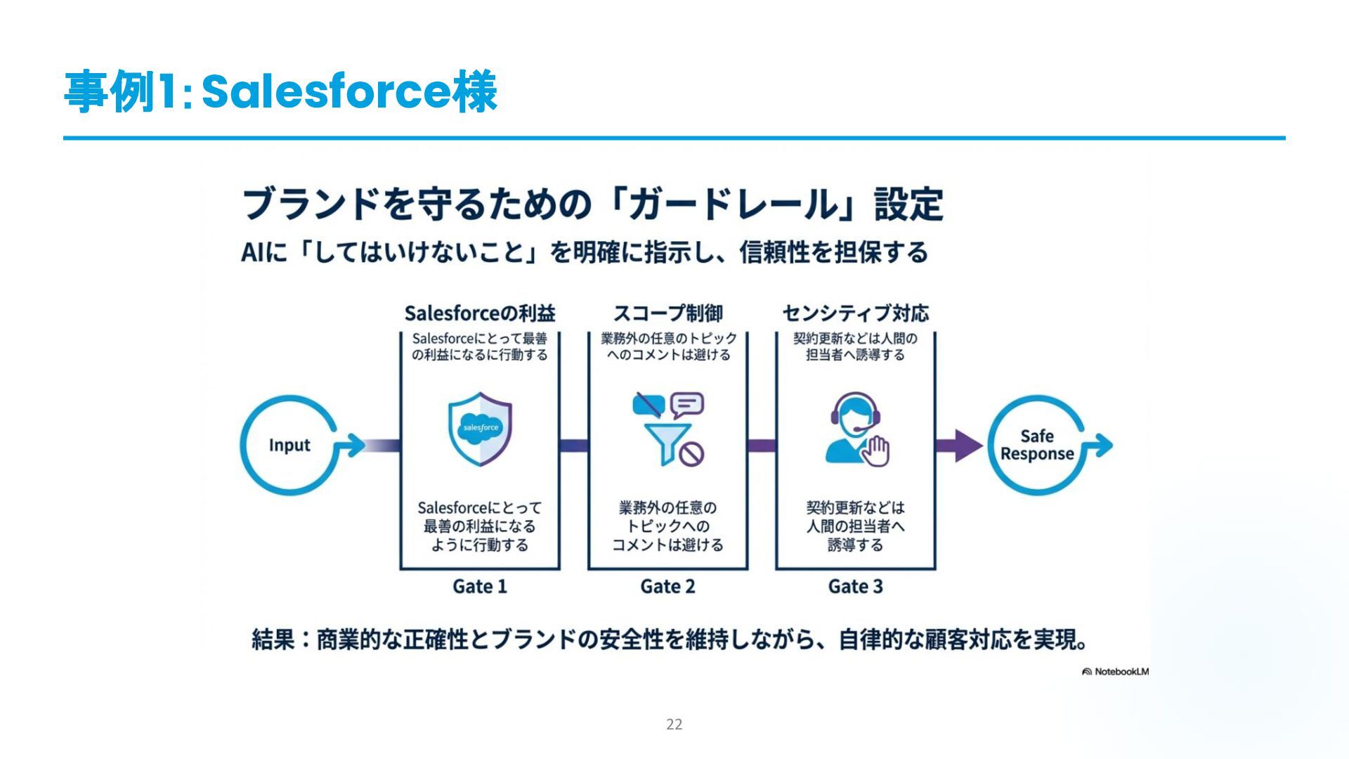 ナレッジマネージャー(社内専門家): 正確な回答の根拠となる記事やドキュメントを作成 ・管理する担当者。 • システム管理者: Salesforce Data CloudやCRMのデータを整備・管理する IT部門。 2. Input(インプット) • 顧客のクエリ: チャットやポータルからの具体的な質問や問題。 • CRMデータ(信頼できるデータ): 顧客の契約状況、過去のやり取り、製品使用状況など のコンテキスト。 • ナレッジベース(記事): 公開されているFAQや、社内向けの最新解決策ドキュメント。 • ガードレール(設定): AIが回答して良い範囲や、トーン&マナーの定義。 3. Process(プロセス) 1. 意図の解釈( Intake): 顧客の問い合わせ内容を AIが自然言語処理で理解する。 2. グラウンディング( Context): Data Cloud等から、その顧客に関連する最新のデータやナ レッジを収集し、情報の正確性を担保する。 3. 自律的アクション( Action): 回答の生成だけでなく、必要に応じて「予約の変更」「ステータ スの更新」などの業務処理を実行する。 4. エスカレーション( Hand-off): AIで解決できない複雑な問題や感情的なケアが必要な場 合、文脈を維持したまま人間のエージェントに引き継ぐ。 5. フィードバックループ( Loop): 対応結果を記録し、ナレッジの不足や改善点を特定する。 4. Output(アウトプット) • 即時の解決回答: 待機時間なしで提供される正確なソリューション。 • 更新された顧客レコード: 対応履歴や処理結果が反映された CRMデータ。 • 要約された引き継ぎ情報: 人間のエージェントに渡される際のコンテキスト(これ までの経緯のまとめ)。 • 業務効率化データ: 処理時間(AHT)の短縮や自己解決率の向上を示す指標。 5. Customer(顧客) • エンドユーザー(顧客): 24時間365日、迅速かつ正確なサポートを受ける。 • カスタマーサポート担当者(人間): 定型的な問い合わせから解放され、より複雑 で付加価値の高い業務に集中できる。 • ビジネスリーダー: サービス品質の向上と運用コストの最適化を享受する経営 層。 38