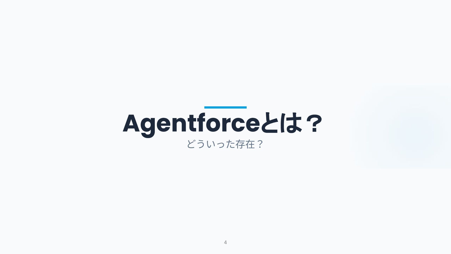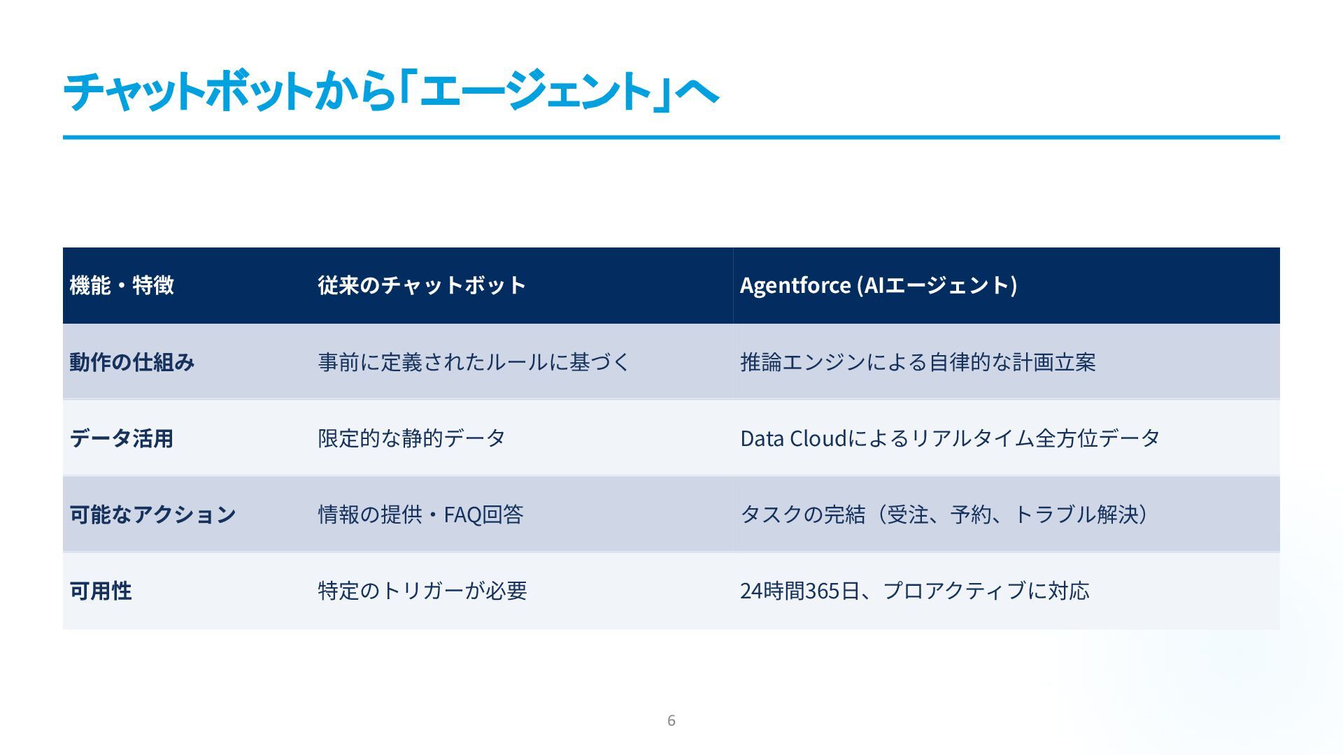 3. チャットボットから「エージェント」へ 機能‧特徴 従来のチャットボット Agentforce (AIエージェント) 動作の仕組み 事前に定義されたルールに基づく 推論エンジンによる⾃律的な計画⽴案 データ活⽤ 限定的な静的データ