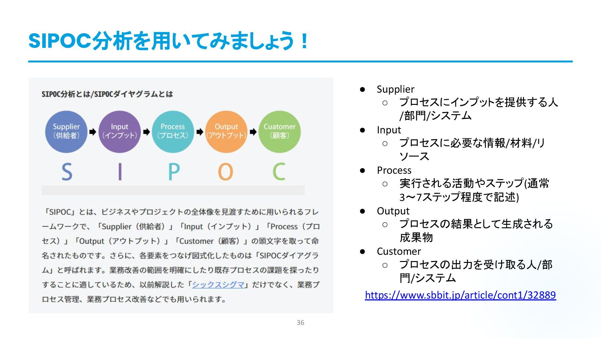 6. SIPOC分析を用いてみましょう! https://www.sbbit.jp/article/cont1/32889 • Supplier ◦ プロセスにインプットを提供する人 /部門/システム • Input ◦