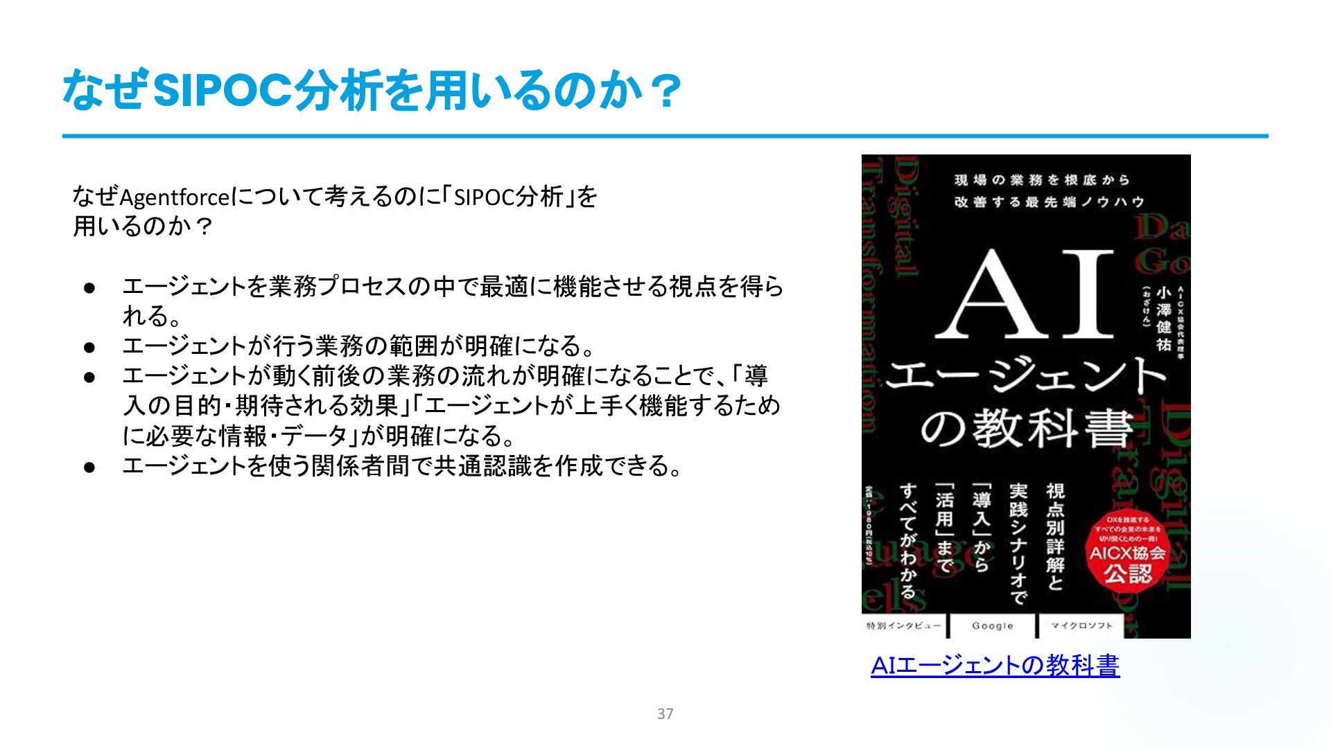 7. なぜSIPOC分析を用いるのか? AIエージェントの教科書 なぜAgentforceについて考えるのに「SIPOC分析」を 用いるのか? • エージェントを業務プロセスの中で最適に機能させる視点を得ら れる。 • エージェントが行う業務の範囲が明確になる。 •