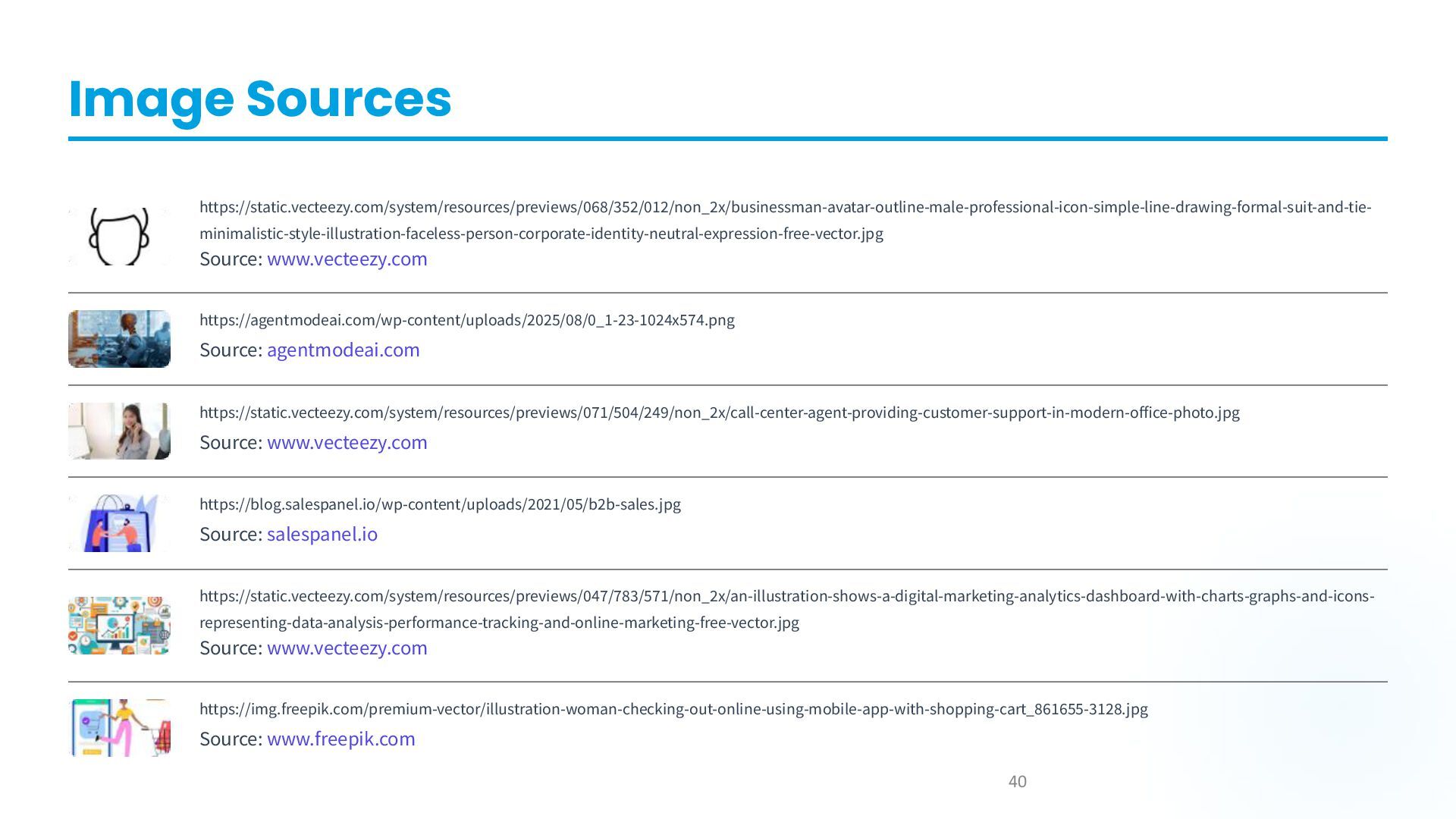 https://blog.salespanel.io/wp-content/uploads/2021/05/b2b-sales.jpg Source: salespanel.io https://static.vecteezy.com/system/resources/previews/047/783/571/non_2x/an-illustration-shows-a-digital-marketing-analytics-dashboard-with-charts-graphs-and-icons- representing-data-analysis-performance-tracking-and-online-marketing-free-vector.jpg Source: www.vecteezy.com https://img.freepik.com/premium-vector/illustration-woman-checking-out-online-using-mobile-app-with-shopping-cart_861655-3128.jpg Source: www.freepik.com Image Sources 40