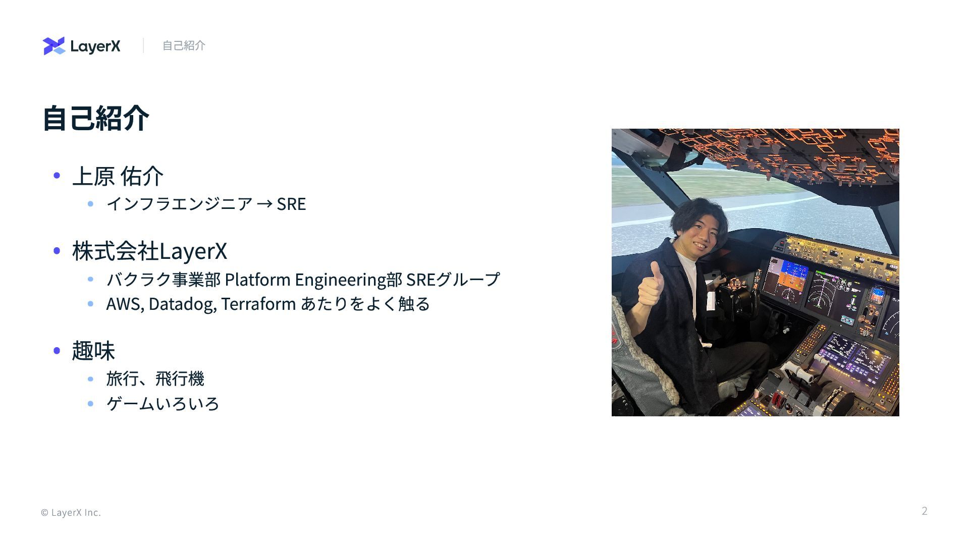Engineering部 SREグループ AWS, Datadog, Terraform あたりをよく触る 趣味 旅行、飛行機 ゲームいろいろ © LayerX Inc. 2
