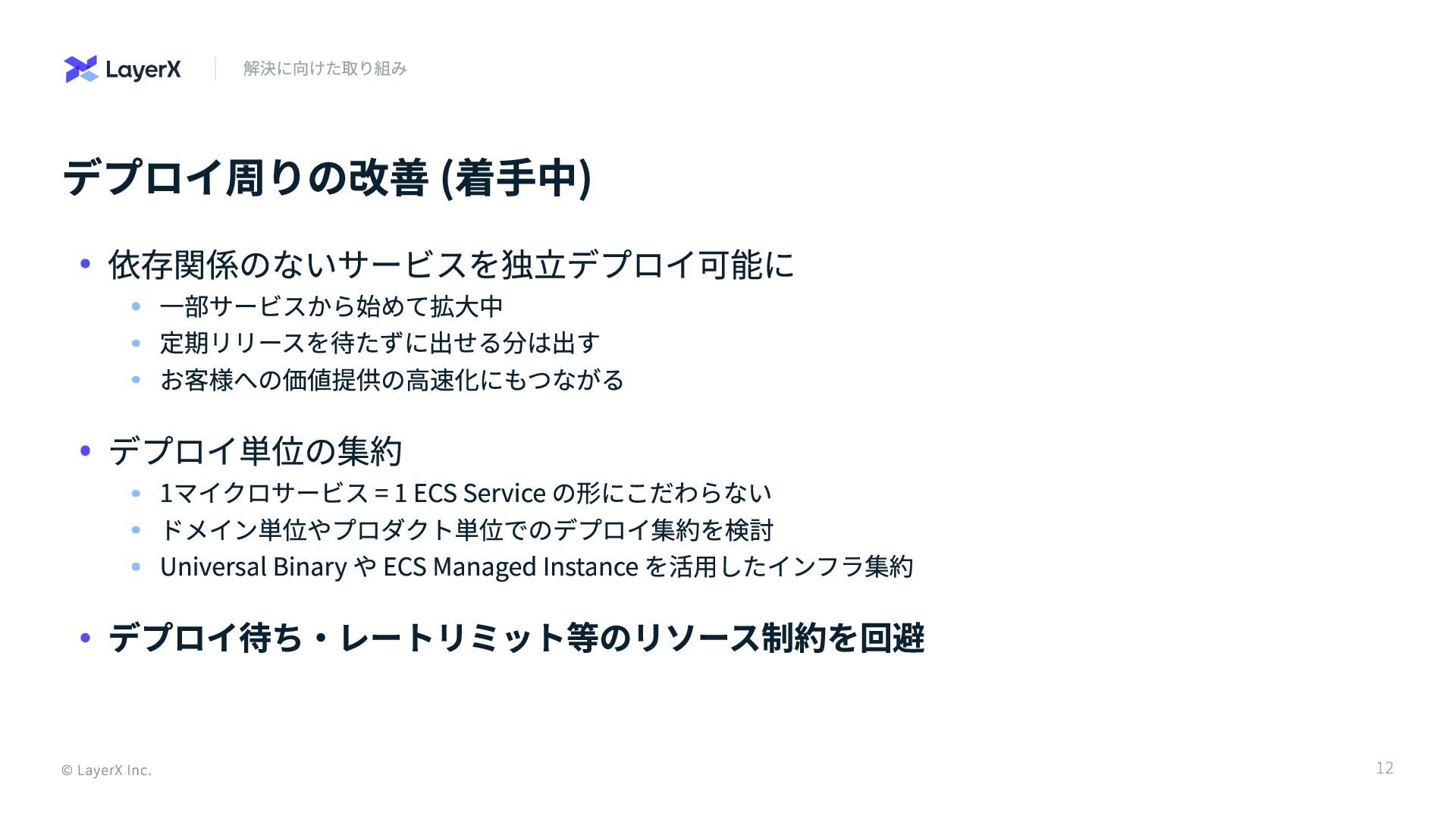 デプロイ周りの改善 (着手中) © LayerX Inc. 解決に向けた取り組み 依存関係のないサービスを独立デプロイ可能に 一部サービスから始めて拡大中 定期リリースを待たずに出せる分は出す お客様への価値提供の高速化にもつながる