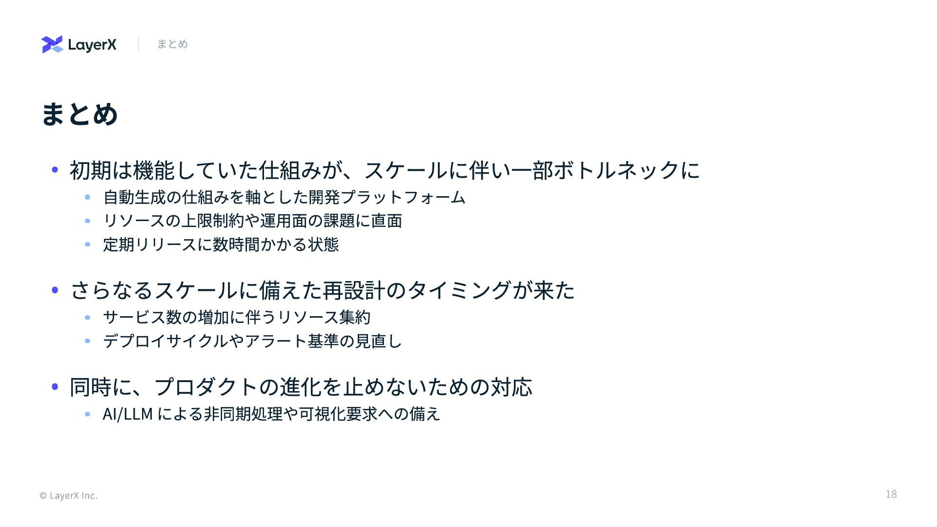 まとめ © LayerX Inc. まとめ 初期は機能していた仕組みが、スケールに伴い一部ボトルネックに 自動生成の仕組みを軸とした開発プラットフォーム リソースの上限制約や運用面の課題に直面 定期リリースに数時間かかる状態 さらなるスケールに備えた再設計のタイミングが来た