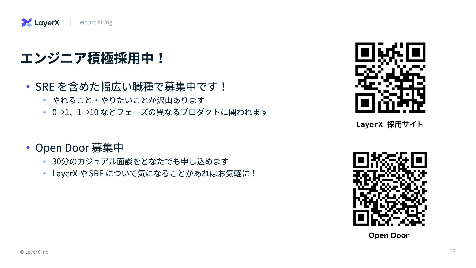 Door 募集中 30分のカジュアル面談をどなたでも申し込めます LayerX や SRE について気になることがあればお気軽に! © LayerX Inc. 19