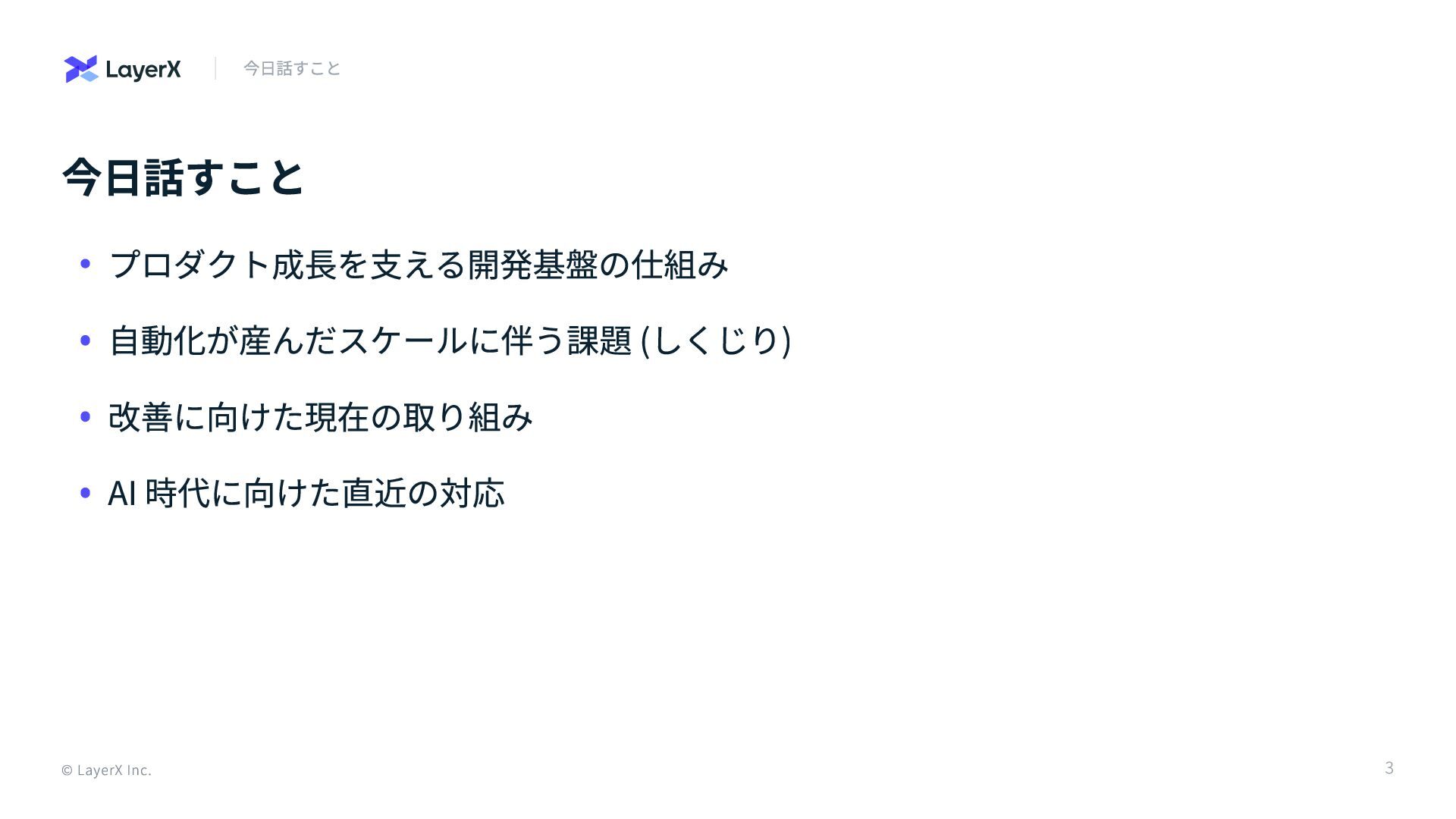 今日話すこと © LayerX Inc. 今日話すこと プロダクト成長を支える開発基盤の仕組み 自動化が産んだスケールに伴う課題 (しくじり) 改善に向けた現在の取り組み AI