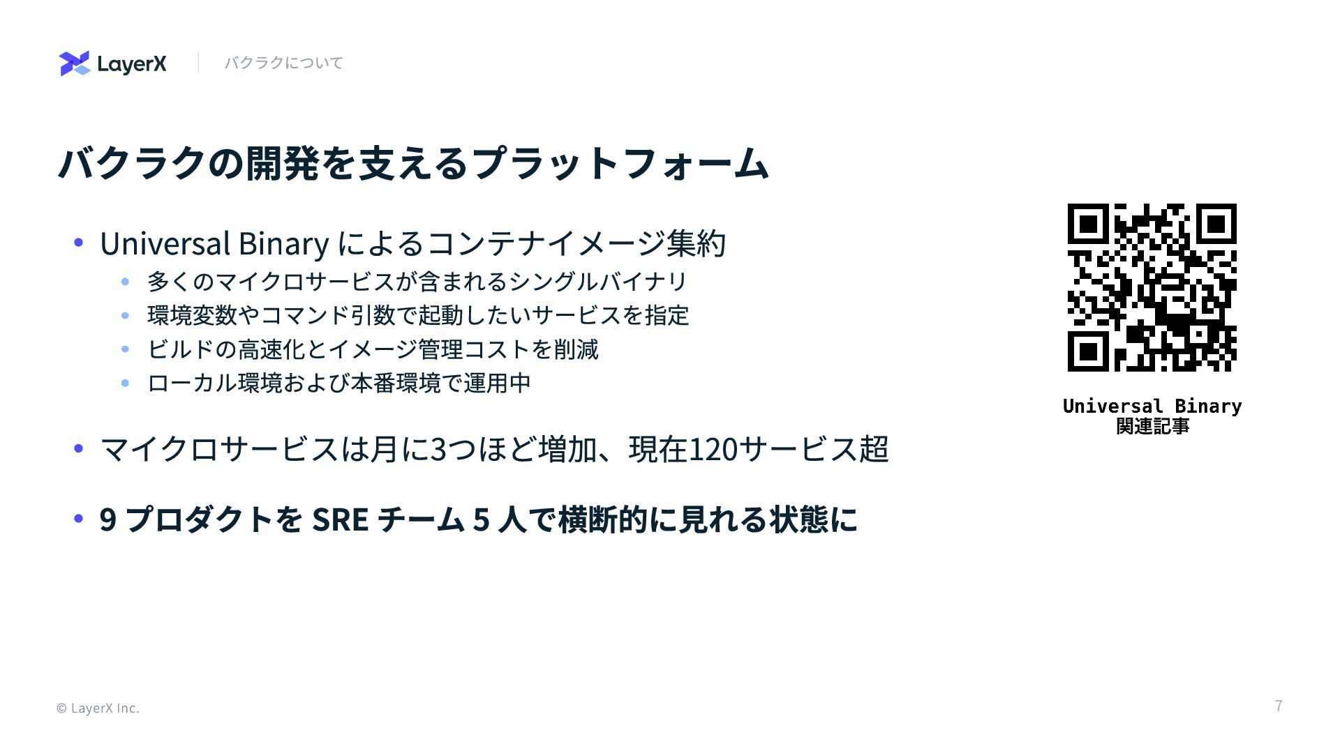 バクラクの開発を支えるプラットフォーム バクラクについて Universal Binary によるコンテナイメージ集約 多くのマイクロサービスが含まれるシングルバイナリ 環境変数やコマンド引数で起動したいサービスを指定 ビルドの高速化とイメージ管理コストを削減 ローカル環境および本番環境で運用中 マイクロサービスは月に3つほど増加、現在120サービス超