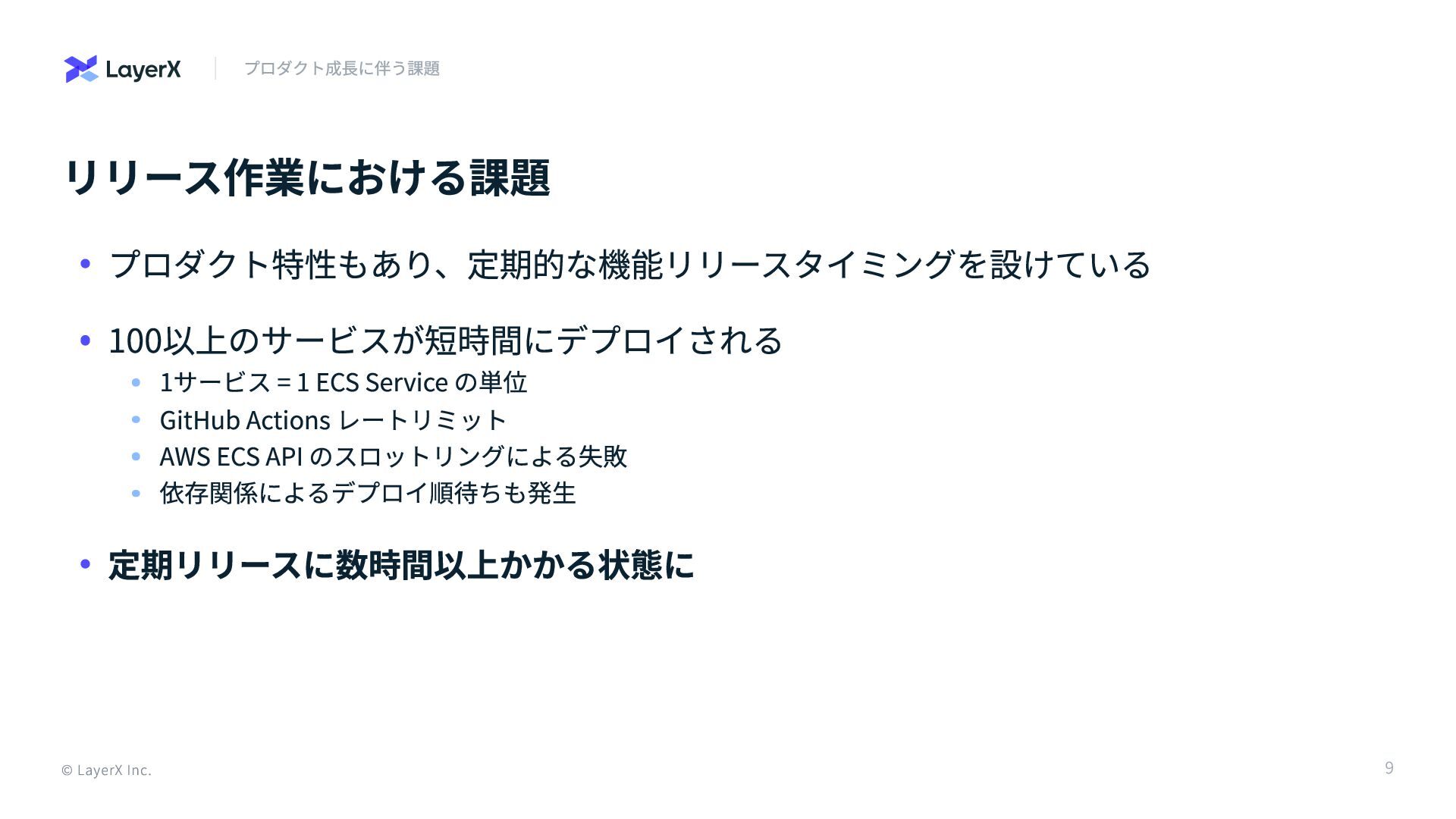リリース作業における課題 © LayerX Inc. プロダクト成長に伴う課題 プロダクト特性もあり、定期的な機能リリースタイミングを設けている 100以上のサービスが短時間にデプロイされる 1サービス = 1