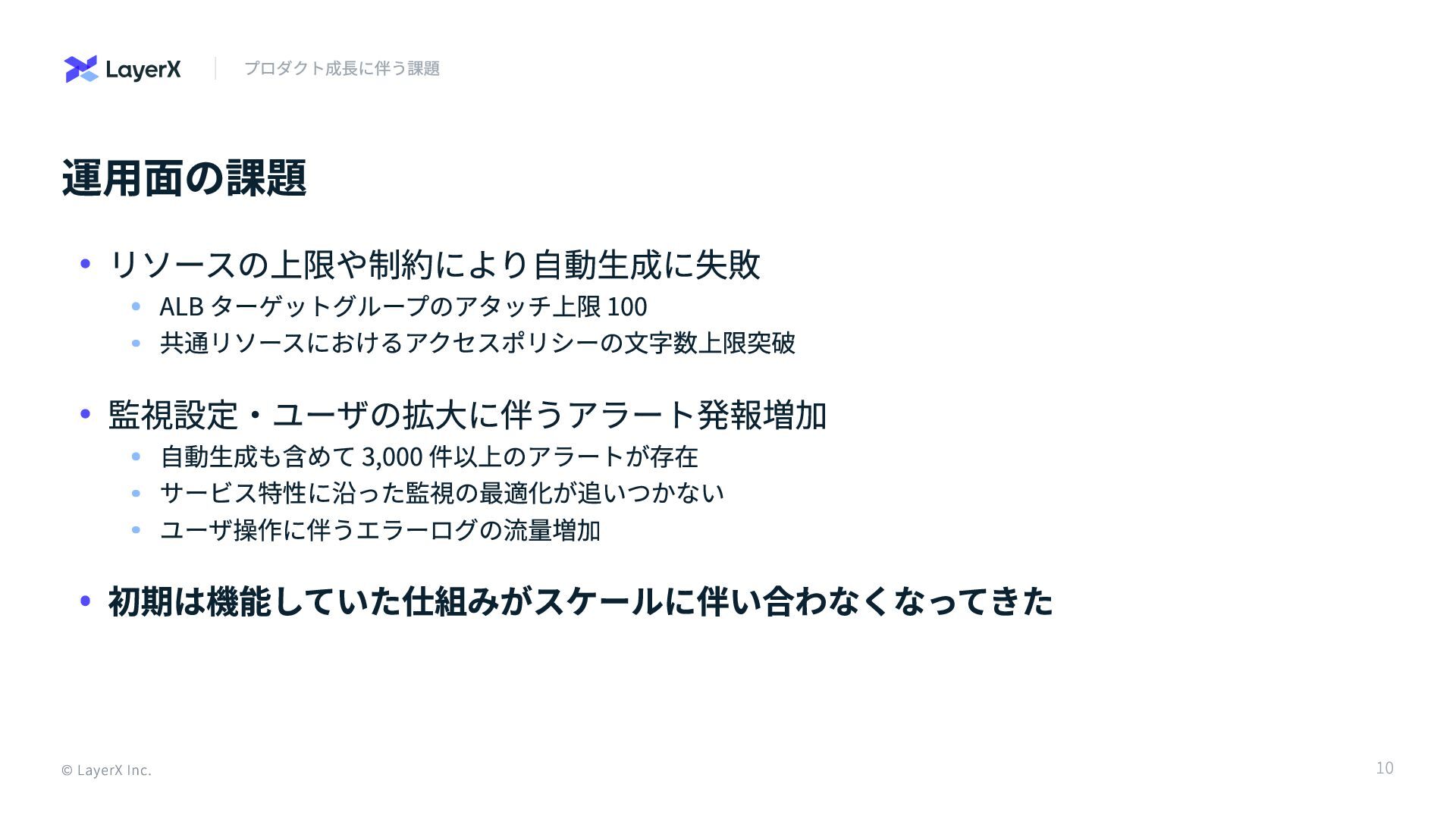 運用面の課題 © LayerX Inc. プロダクト成長に伴う課題 リソースの上限や制約により自動生成に失敗 ALB ターゲットグループのアタッチ上限 100 共通リソースにおけるアクセスポリシーの文字数上限突破