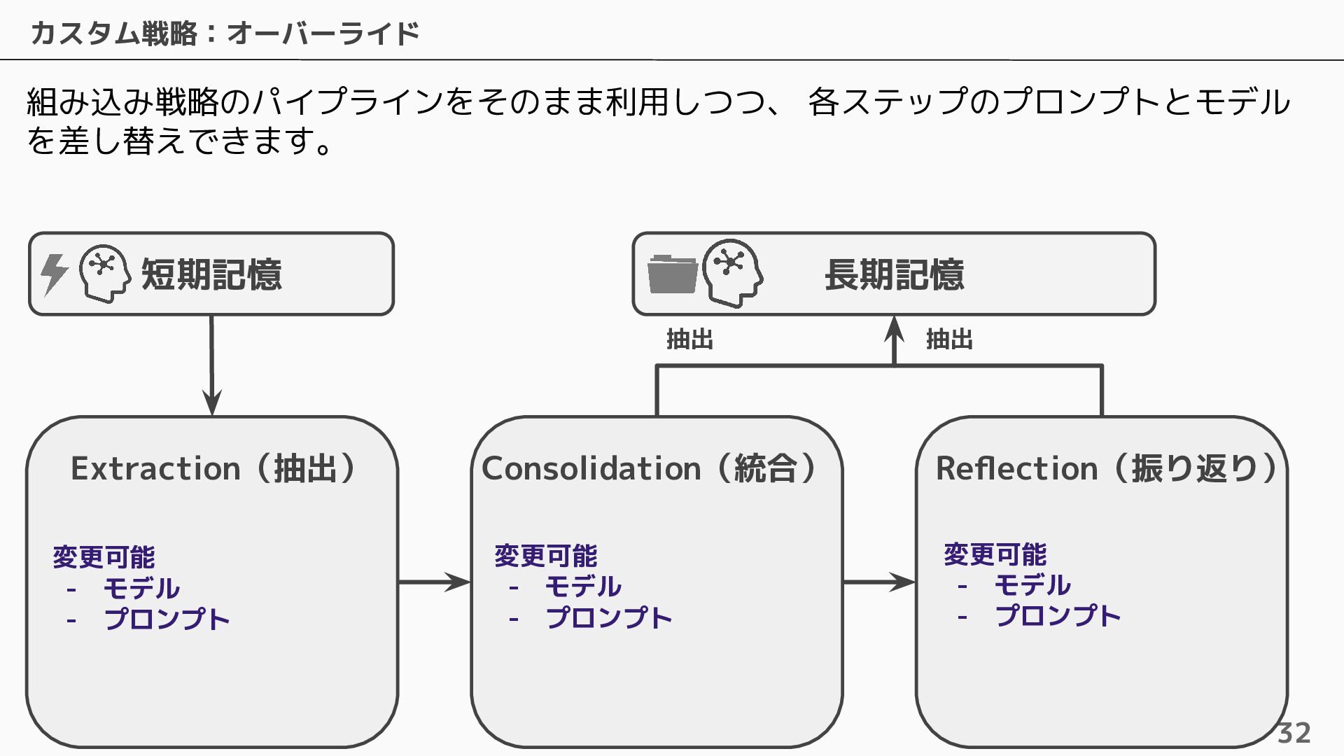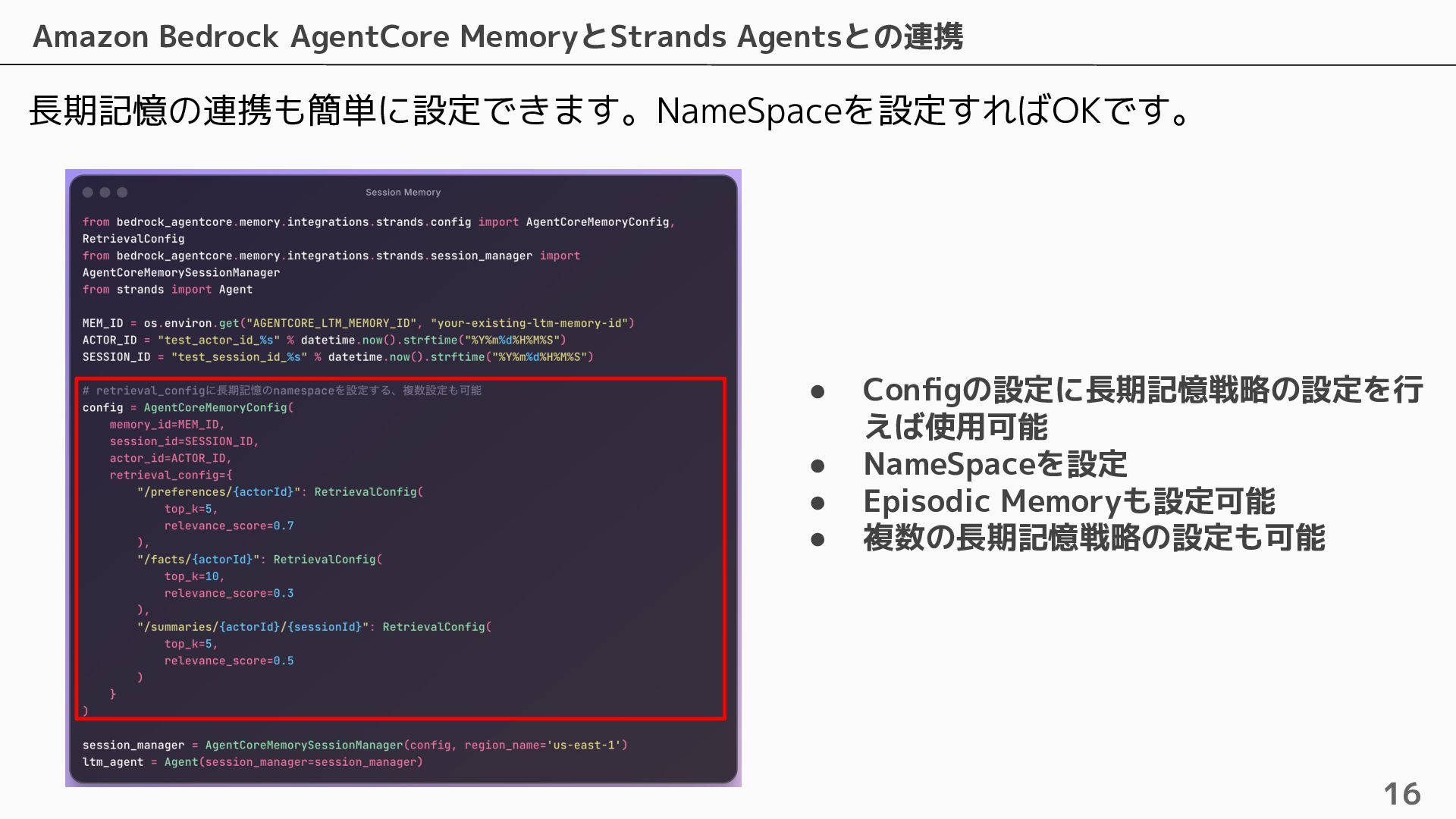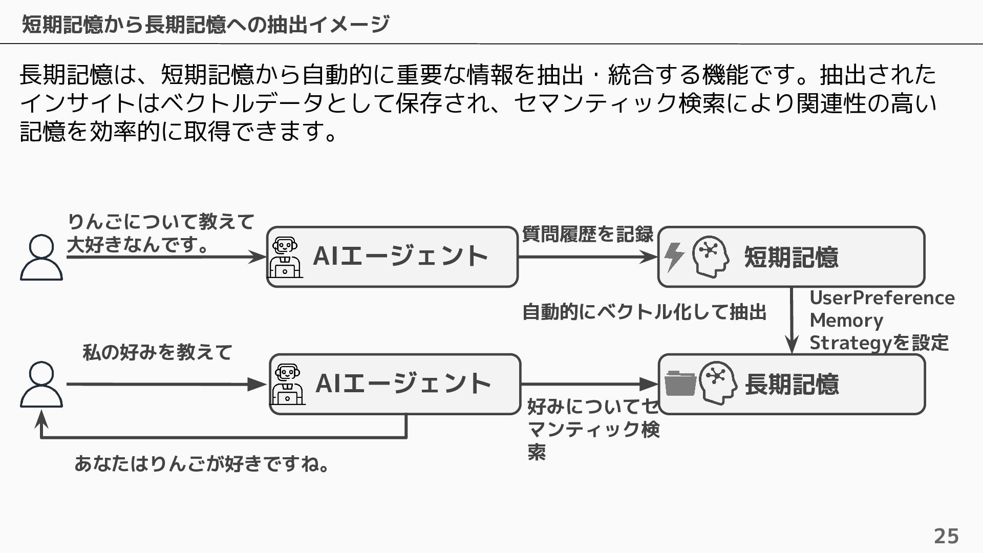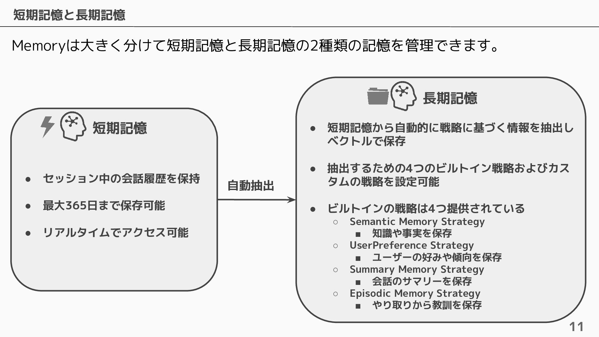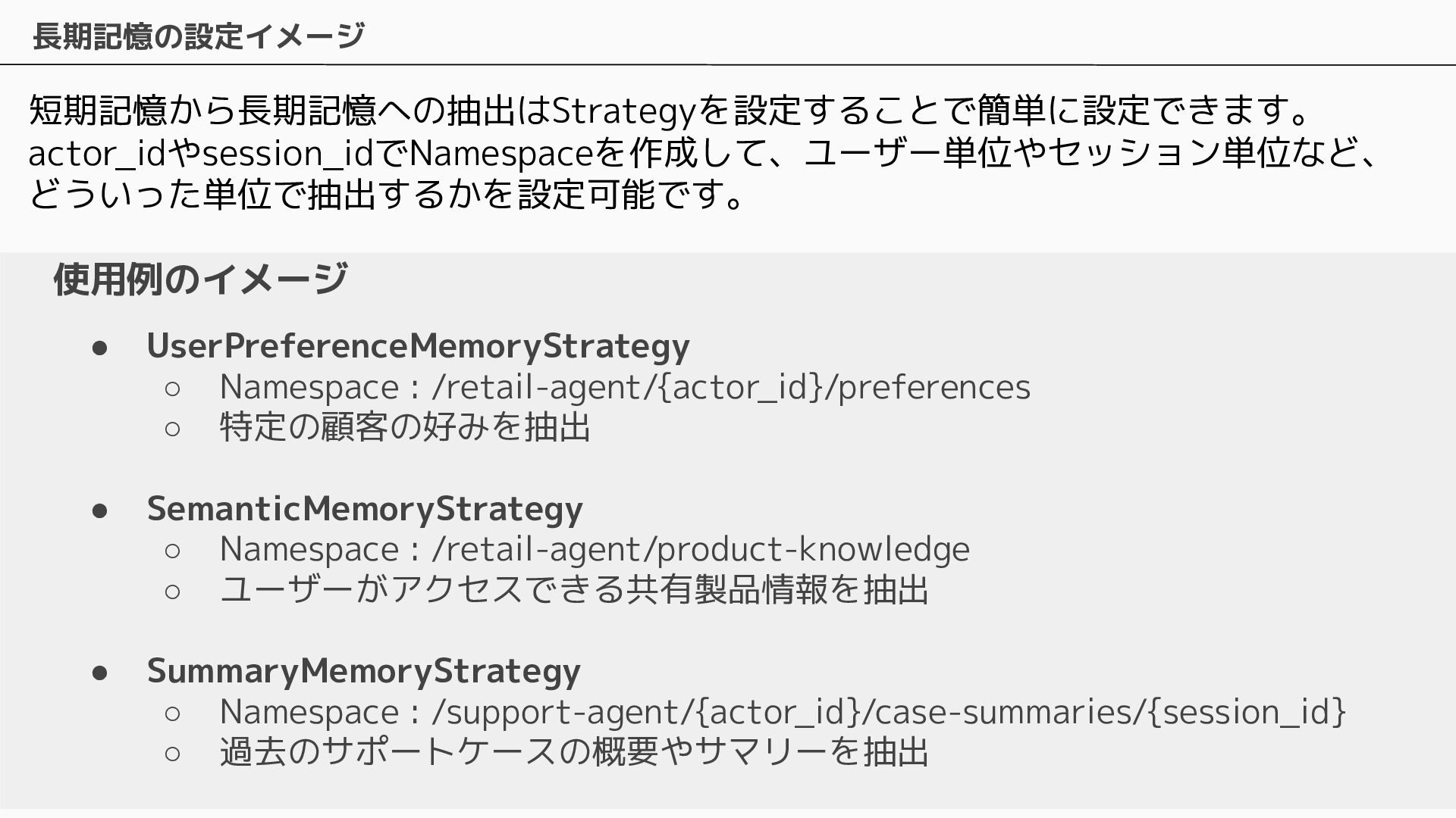 長期記憶 • 短期記憶から自動的に戦略に基づく情報を抽出し ベクトルで保存 • 抽出するための4つのビルトイン戦略およびカス タムの戦略を設定可能 • ビルトインの戦略は4つ提供されている ◦ Semantic Memory Strategy ▪ 知識や事実を保存 ◦ UserPreference Strategy ▪ ユーザーの好みや傾向を保存 ◦ Summary Memory Strategy ▪ 会話のサマリーを保存 ◦ Episodic Memory Strategy ▪ やり取りから教訓を保存 自動抽出
