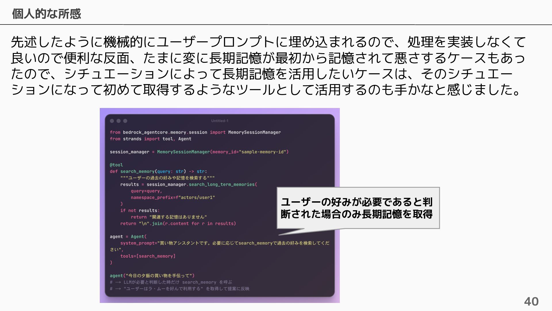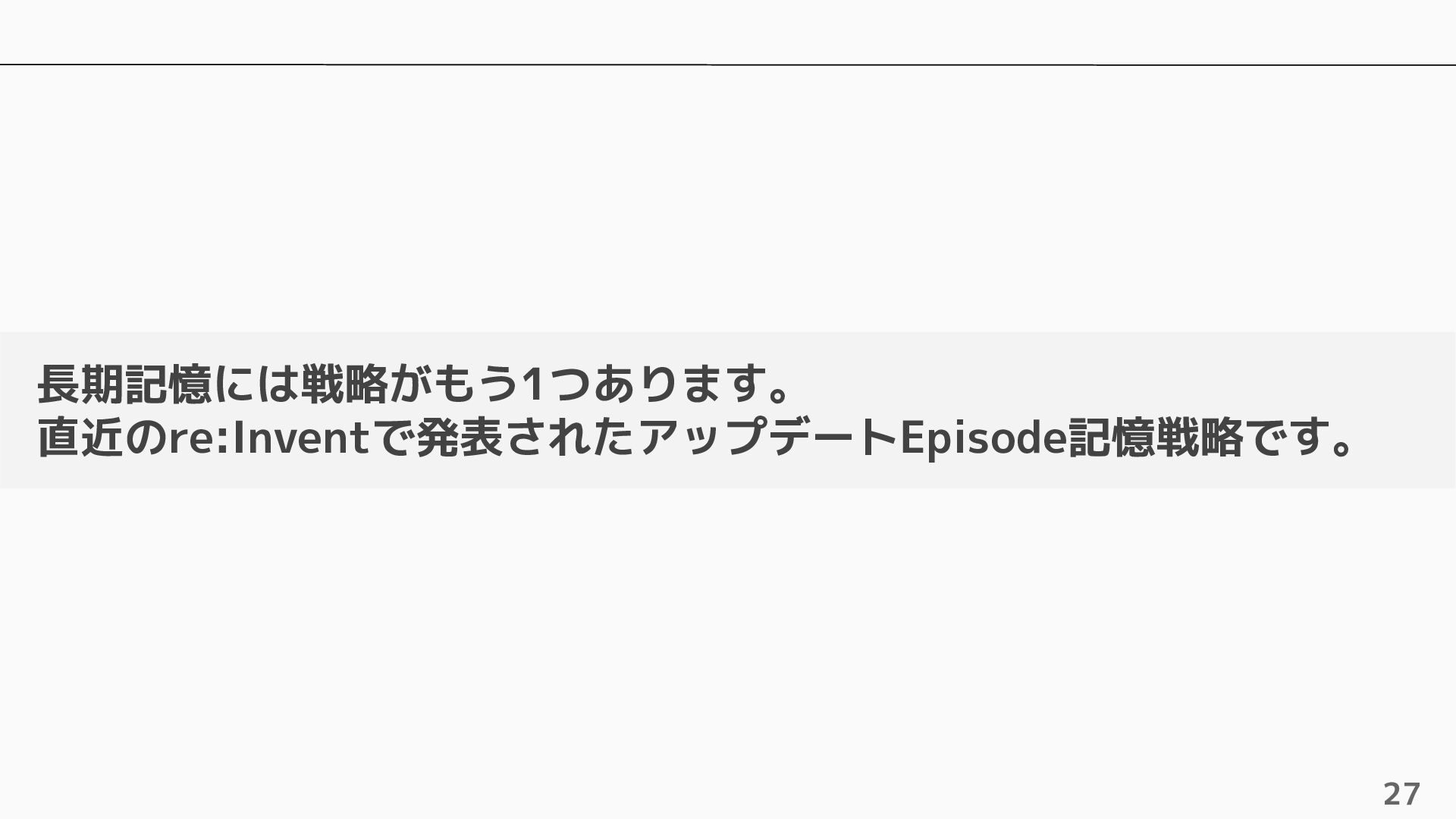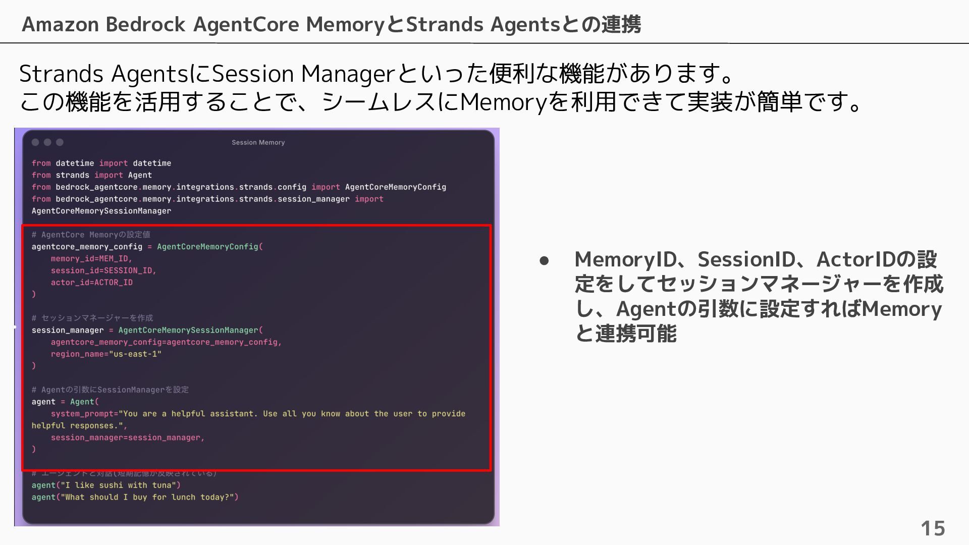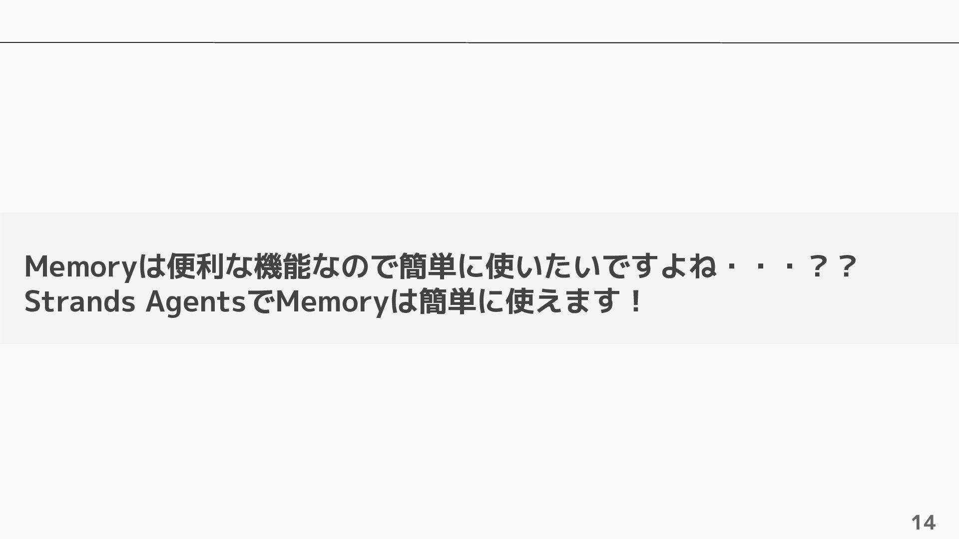 長期記憶 • 短期記憶から自動的に戦略に基づく情報を抽出し ベクトルで保存 • 抽出するための4つのビルトイン戦略およびカス タムの戦略を設定可能 • ビルトインの戦略は4つ提供されている ◦ Semantic Memory Strategy ▪ 知識や事実を保存 ◦ UserPreference Strategy ▪ ユーザーの好みや傾向を保存 ◦ Summary Memory Strategy ▪ 会話のサマリーを保存 ◦ Episodic Memory Strategy ▪ やり取りから教訓を保存 自動抽出