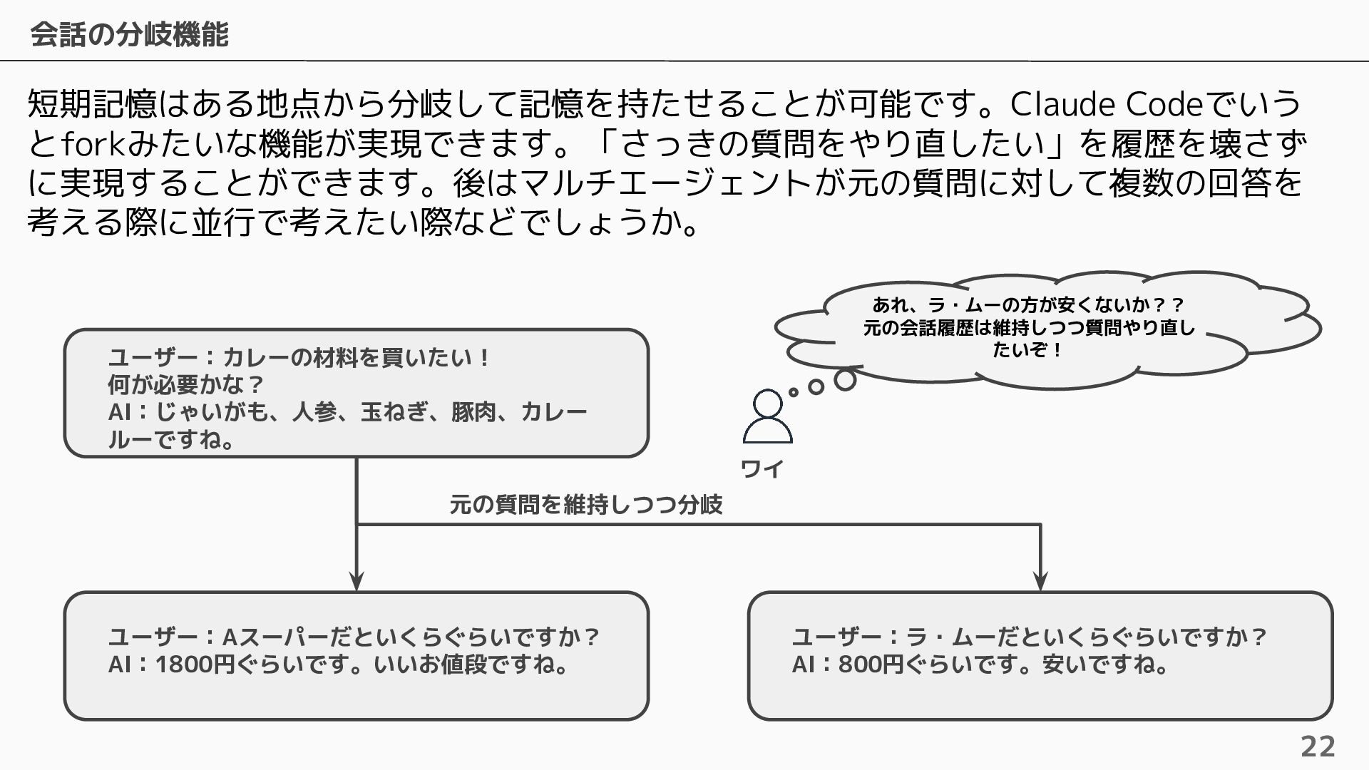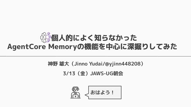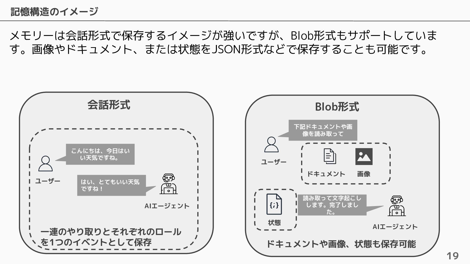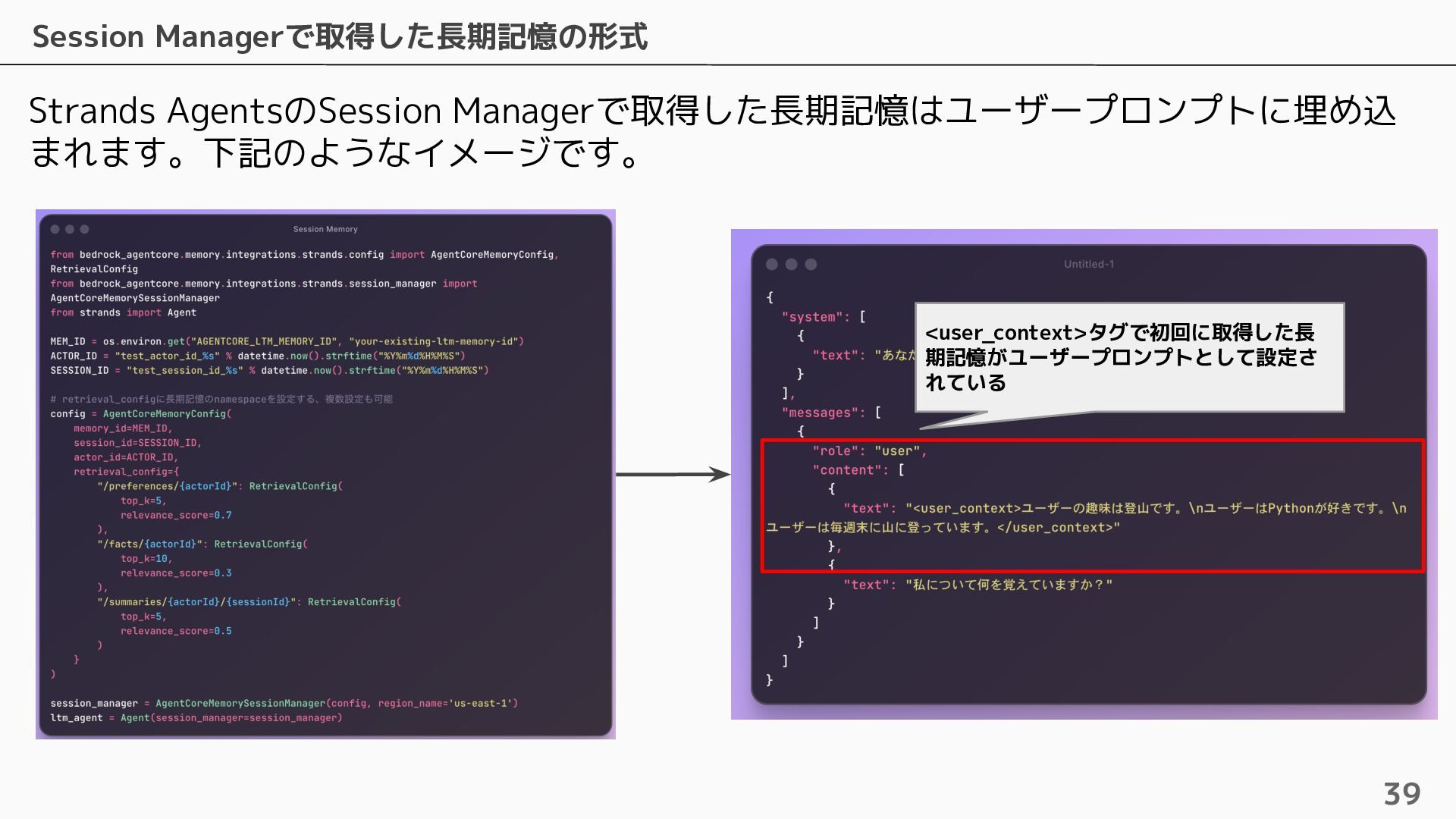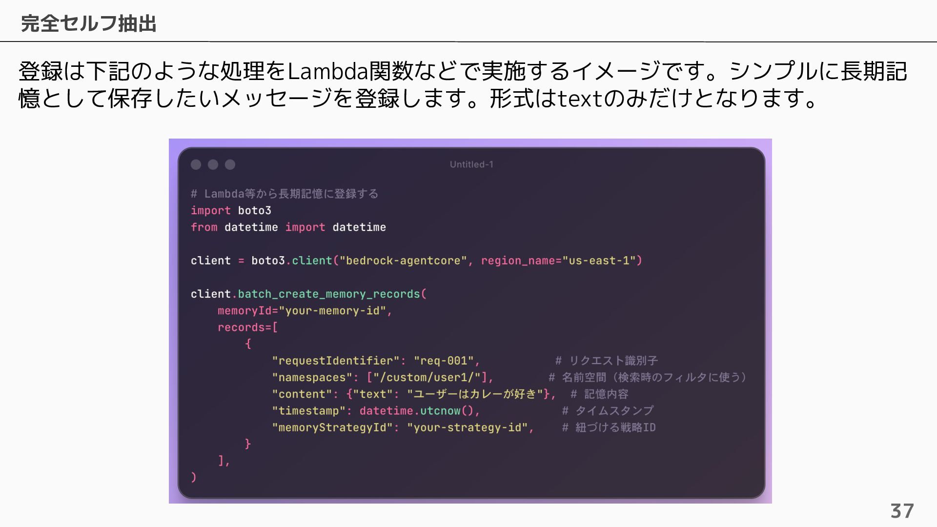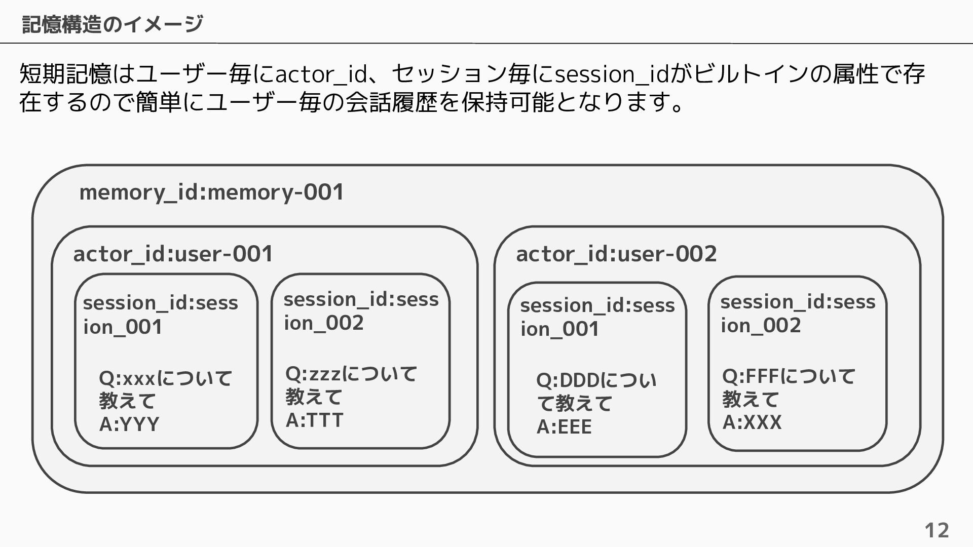 長期記憶 • 短期記憶から自動的に戦略に基づく情報を抽出し ベクトルで保存 • 抽出するための4つのビルトイン戦略およびカス タムの戦略を設定可能 • ビルトインの戦略は4つ提供されている ◦ Semantic Memory Strategy ▪ 知識や事実を保存 ◦ UserPreference Strategy ▪ ユーザーの好みや傾向を保存 ◦ Summary Memory Strategy ▪ 会話のサマリーを保存 ◦ Episodic Memory Strategy ▪ やり取りから教訓を保存 自動抽出
