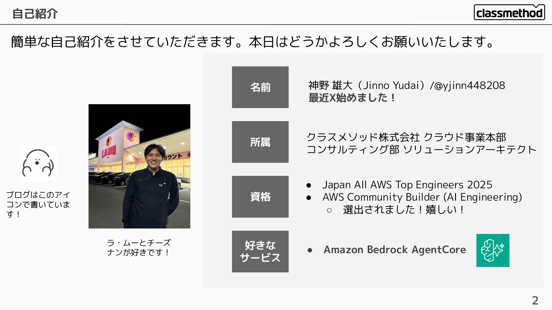 クラウド事業本部 コンサルティング部 ソリューションアーキテクト • Japan All AWS Top Engineers 2025 • AWS Community Builder (AI Engineering) ◦ 選出されました!嬉しい! 資格 好きな サービス ブログはこのアイ コンで書いていま す! ラ・ムーとチーズ ナンが好きです! • Amazon Bedrock AgentCore