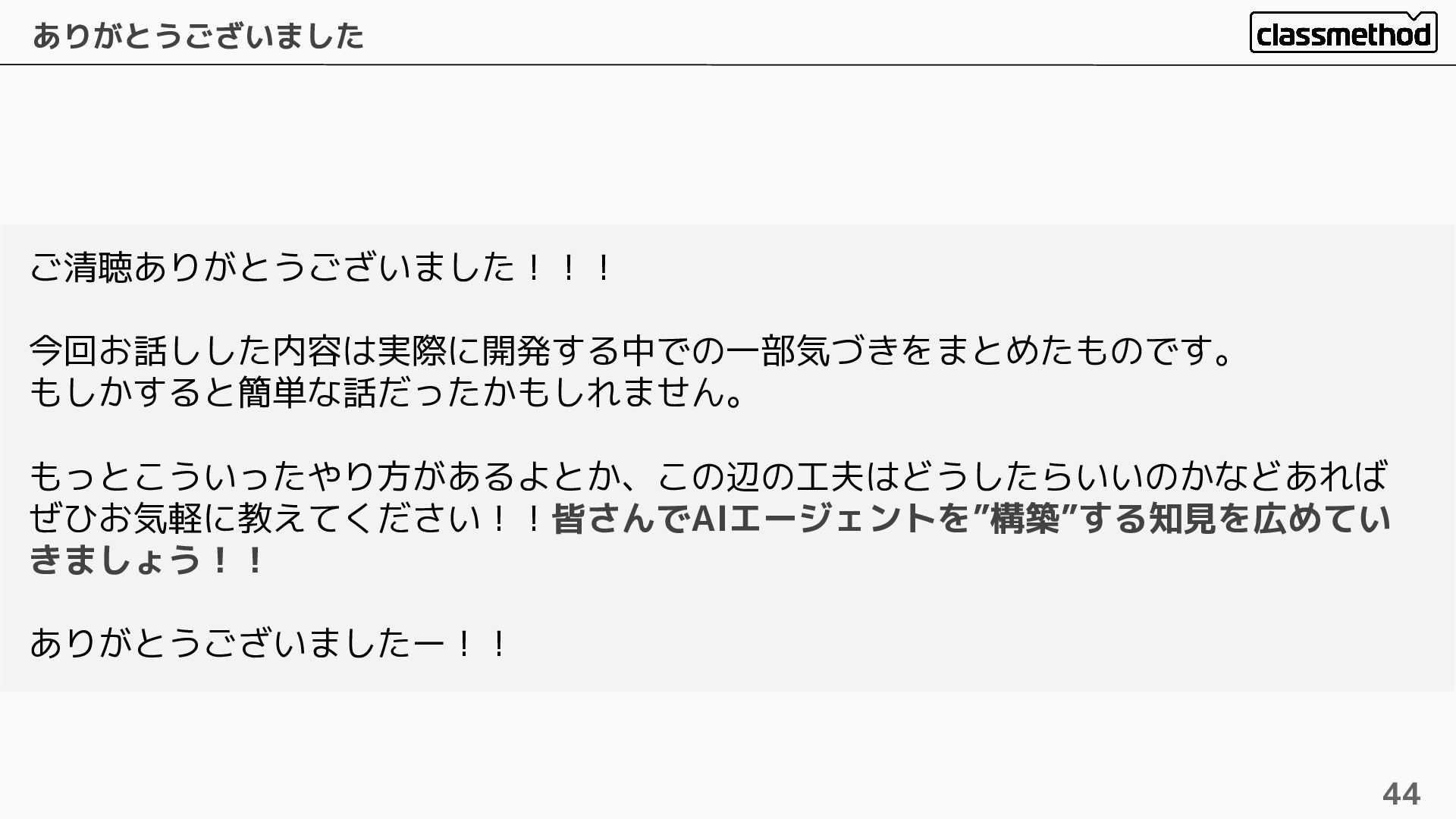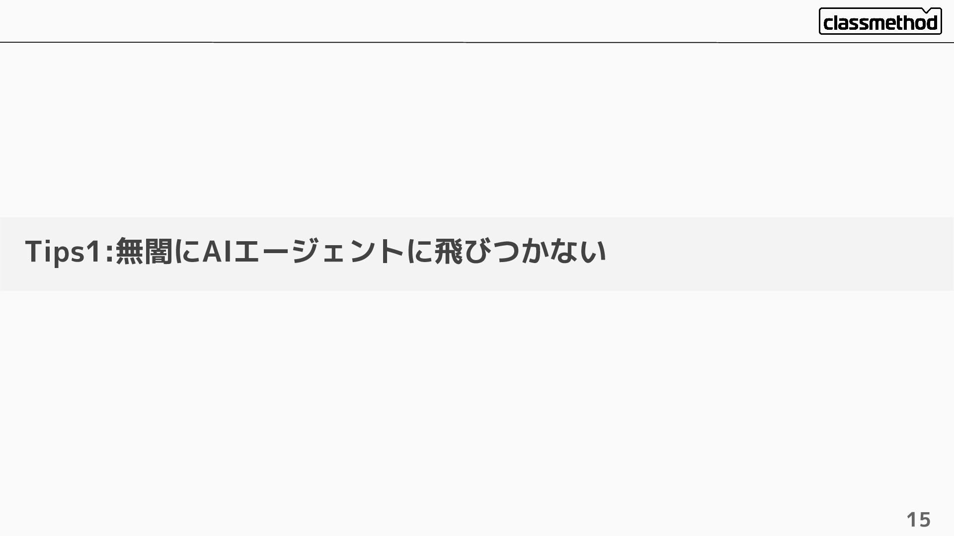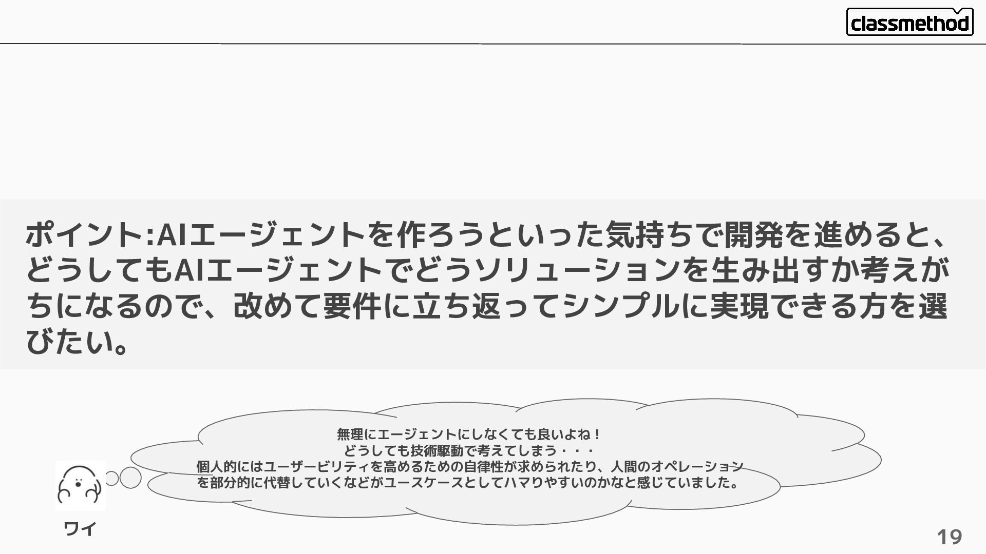 要 エージェント単体で完結、シンプル レイテンシ エージェント間の通信往復が発生し遅延 が積み重なる 障害がエージェント単位で局所化 トークン消費 各エージェントが個別にコンテキストを 持つため総トークン量が増大 1エージェントのコンテキストで収まるケースも。 障害の影響範囲 1エージェントの障害が連鎖しうる 障害がエージェント単位で局所化 向いているケース エージェント間のリアルタイム協調が必 須な場面(例: 保険診断で審査・リスク 評価・約款確認の各エージェントが相互 に判断を突き合わせるなど) 1タスク=1エージェントで完結する場面(例: 記事要約、ルー ル設定、RAG検索)