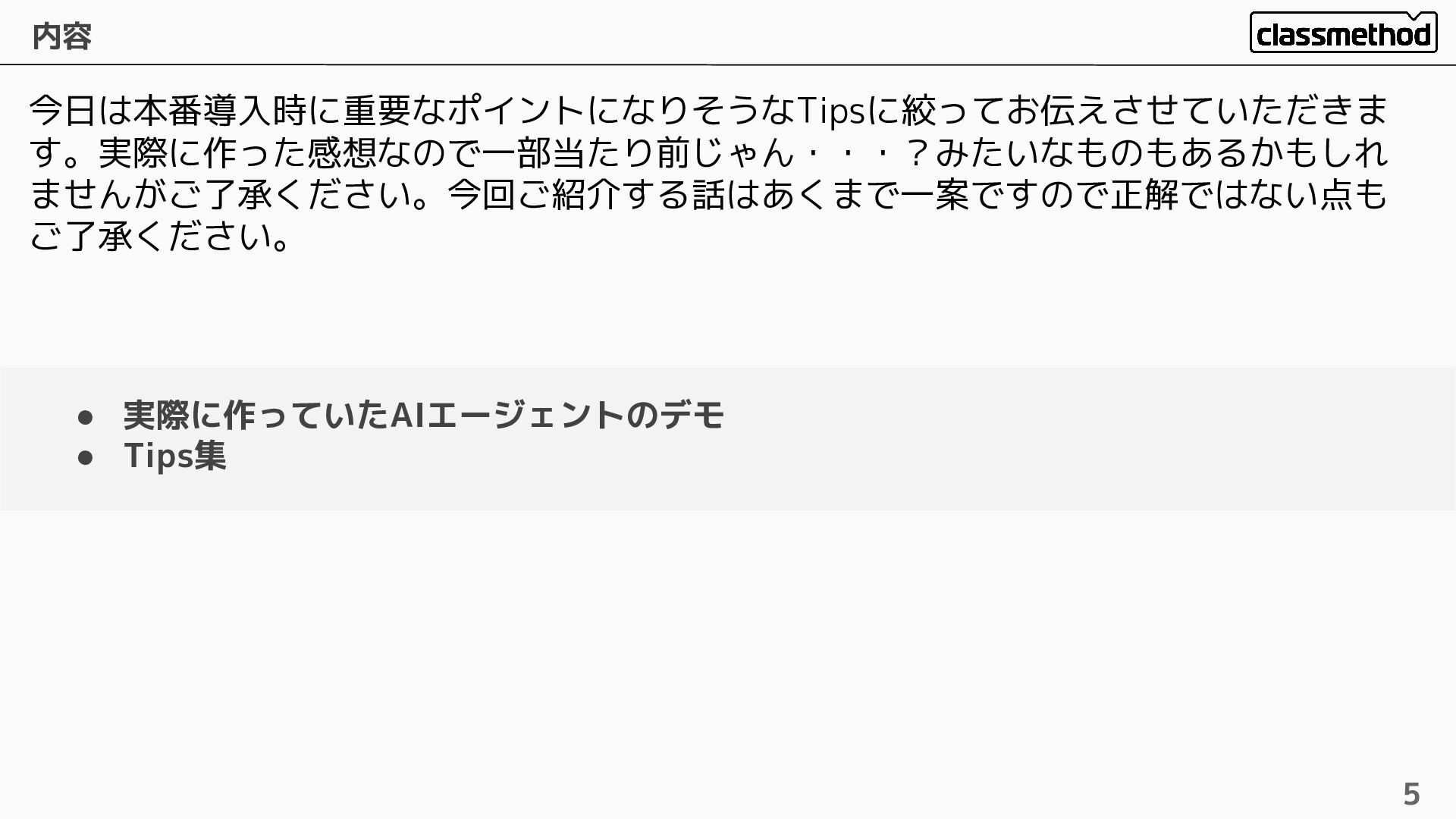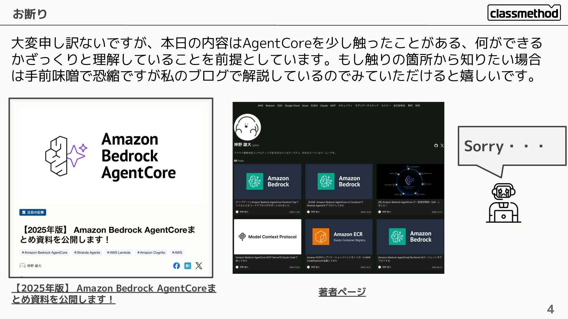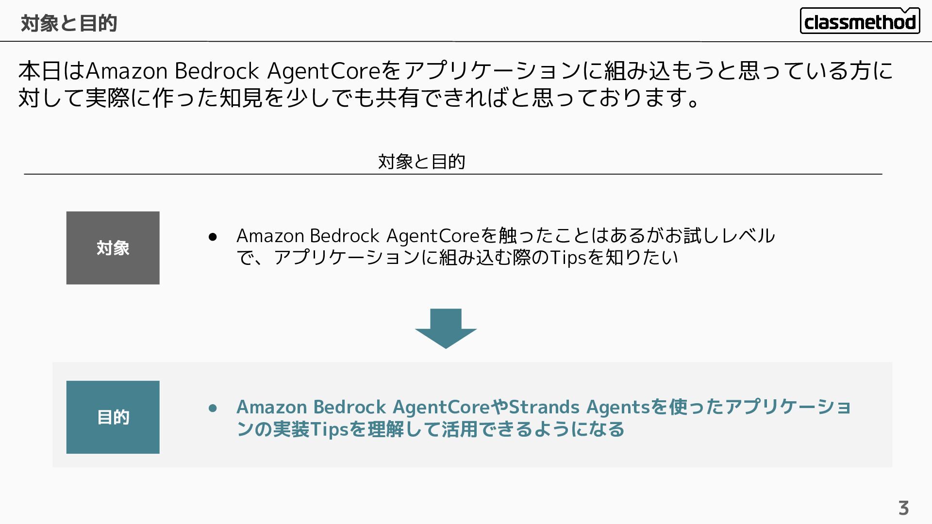 Bedrock AgentCoreを触ったことはあるがお試しレベル で、アプリケーションに組み込む際のTipsを知りたい 目的 • Amazon Bedrock AgentCoreやStrands Agentsを使ったアプリケーショ ンの実装Tipsを理解して活用できるようになる