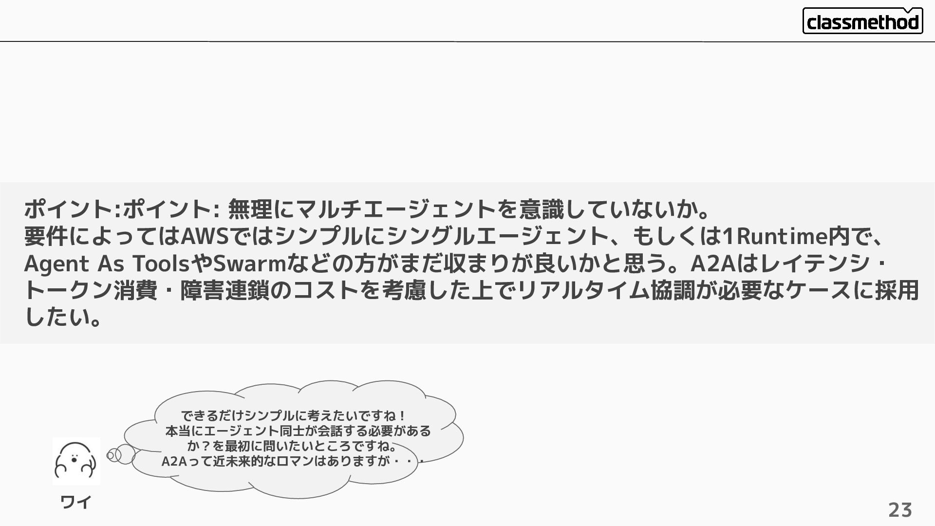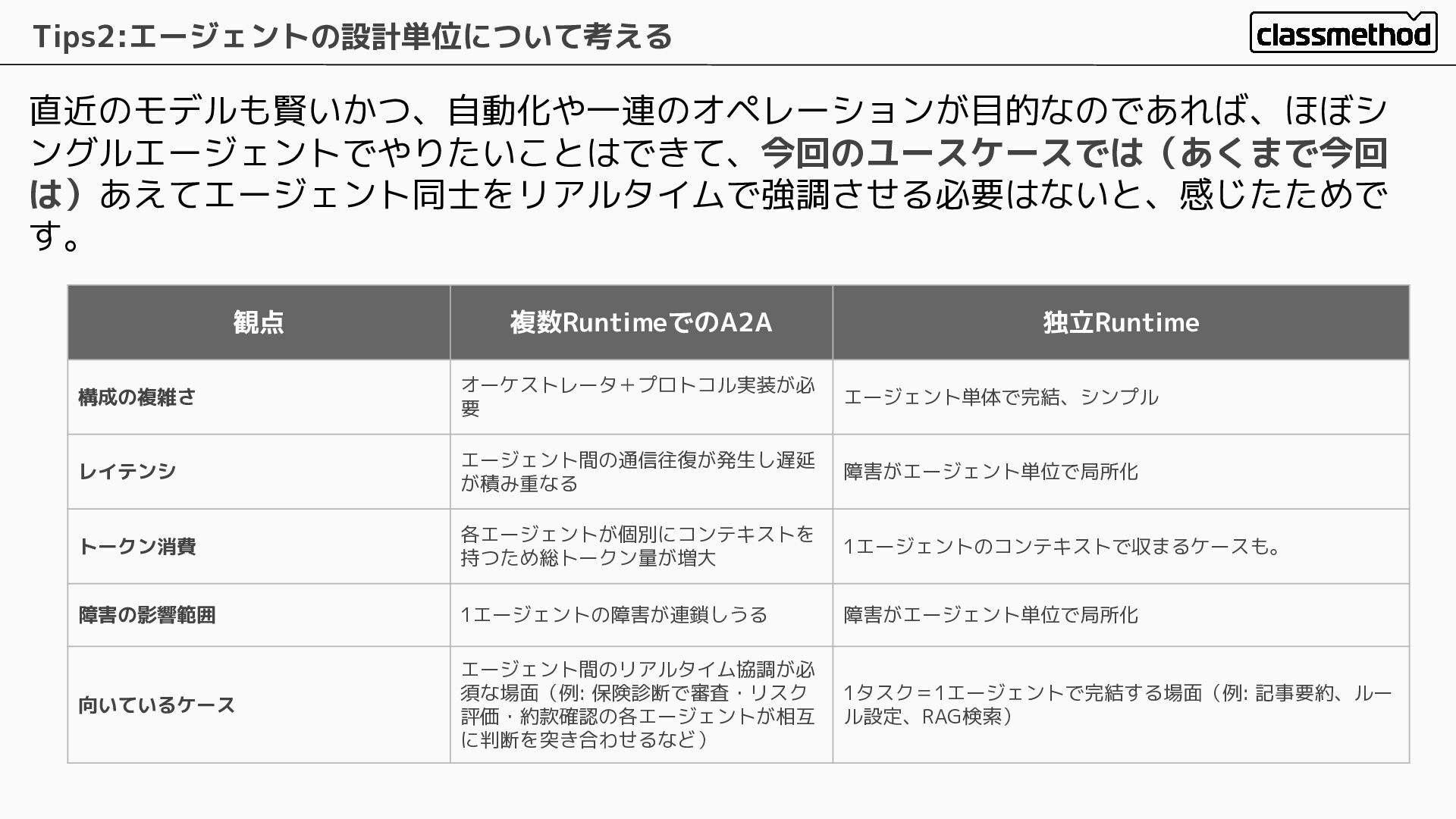 3. 直近のモデルも賢いかつ、自動化や一連のオペレーションが目的なのであれば、ほぼシ ングルエージェントでやりたいことはできて、今回のユースケースでは(あくまで今回 は)あえてエージェント同士をリアルタイムで強調させる必要はないと、感じたためで す。 Tips2:エージェントの設計単位について考える 観点 複数RuntimeでのA2A 独立Runtime 構成の複雑さ オーケストレータ+プロトコル実装が必