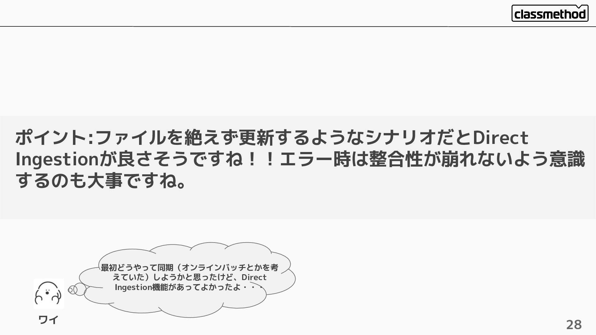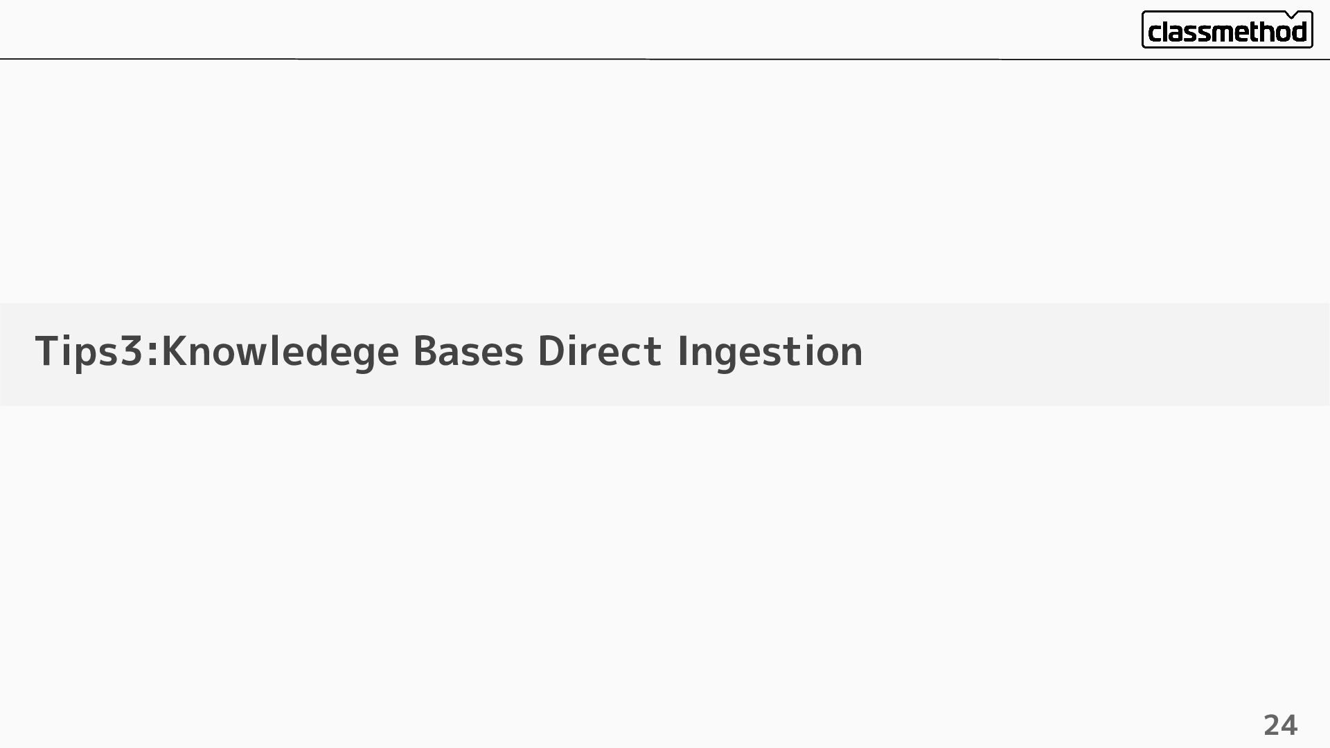 5. InfoOrgainzerでは取り込んだデータをRAGとしてすぐに活用したい要件がありました。 従来のIngestionだと取り込みのたびに全件差分を見て・・・を繰り返すととても現実的 ではなく今回はこのDircet Ingestionを使ってみようと思い採用しました! Tips3:Knowledege Bases Direct Ingestion 26 ユーザー