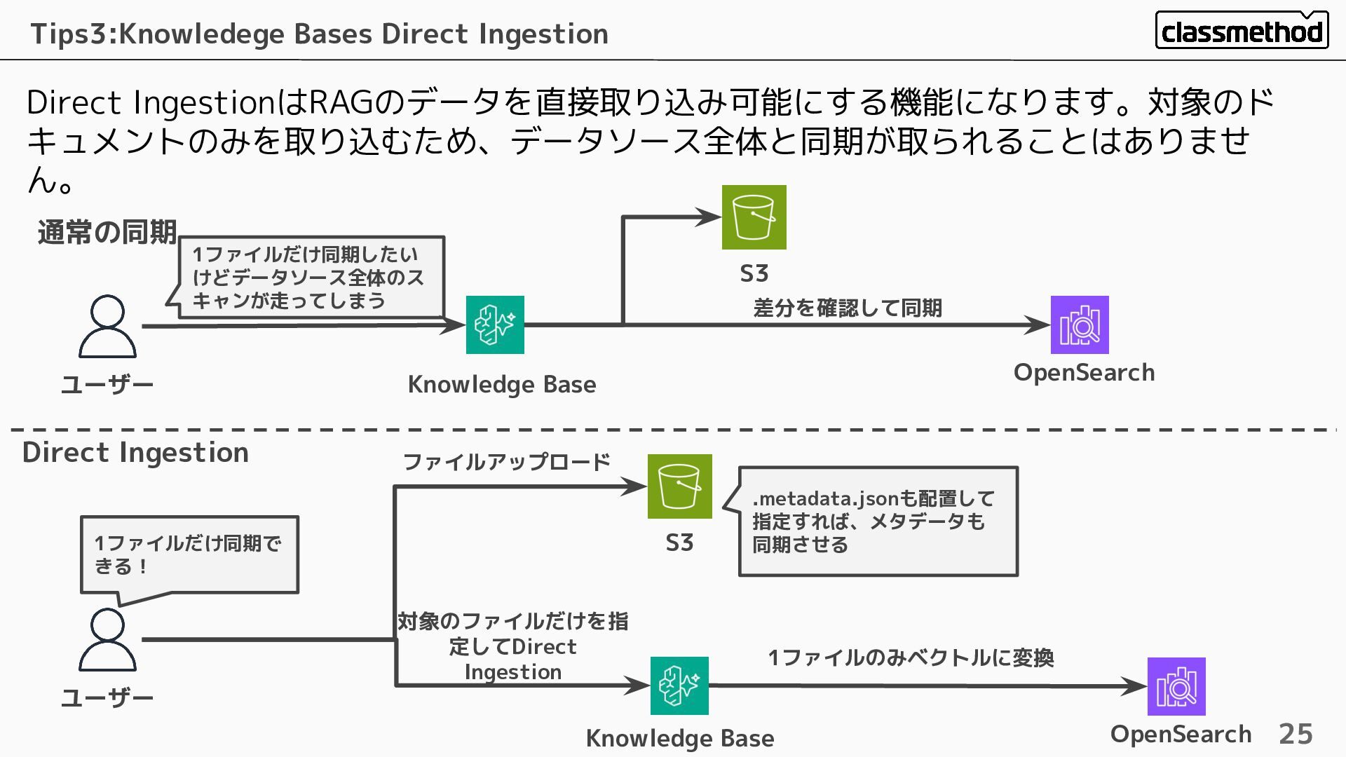 1ファイルだけ同期で きる! S3 Knowledge Base OpenSearch ファイルアップロード 対象のファイルだけを指 定してDirect Ingestion 1ファイルのみベクトルに変換 Direct Ingestion 通常の同期 ユーザー 1ファイルだけ同期したい けどデータソース全体のス キャンが走ってしまう Knowledge Base S3 OpenSearch 差分を確認して同期 .metadata.jsonも配置して 指定すれば、メタデータも 同期させる