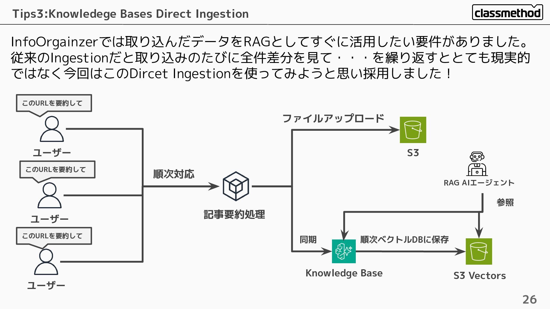 4. Direct IngestionはRAGのデータを直接取り込み可能にする機能になります。対象のド キュメントのみを取り込むため、データソース全体と同期が取られることはありませ ん。 Tips3:Knowledege Bases Direct Ingestion 25 ユーザー