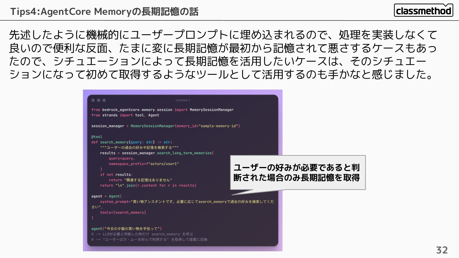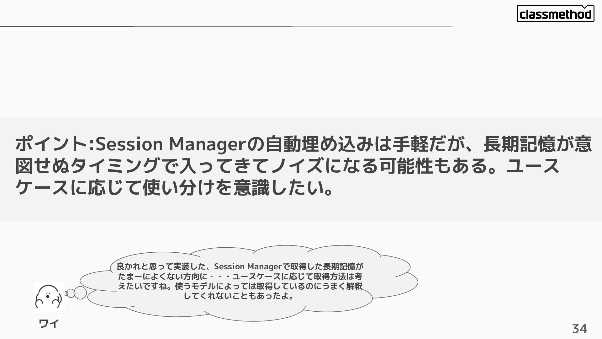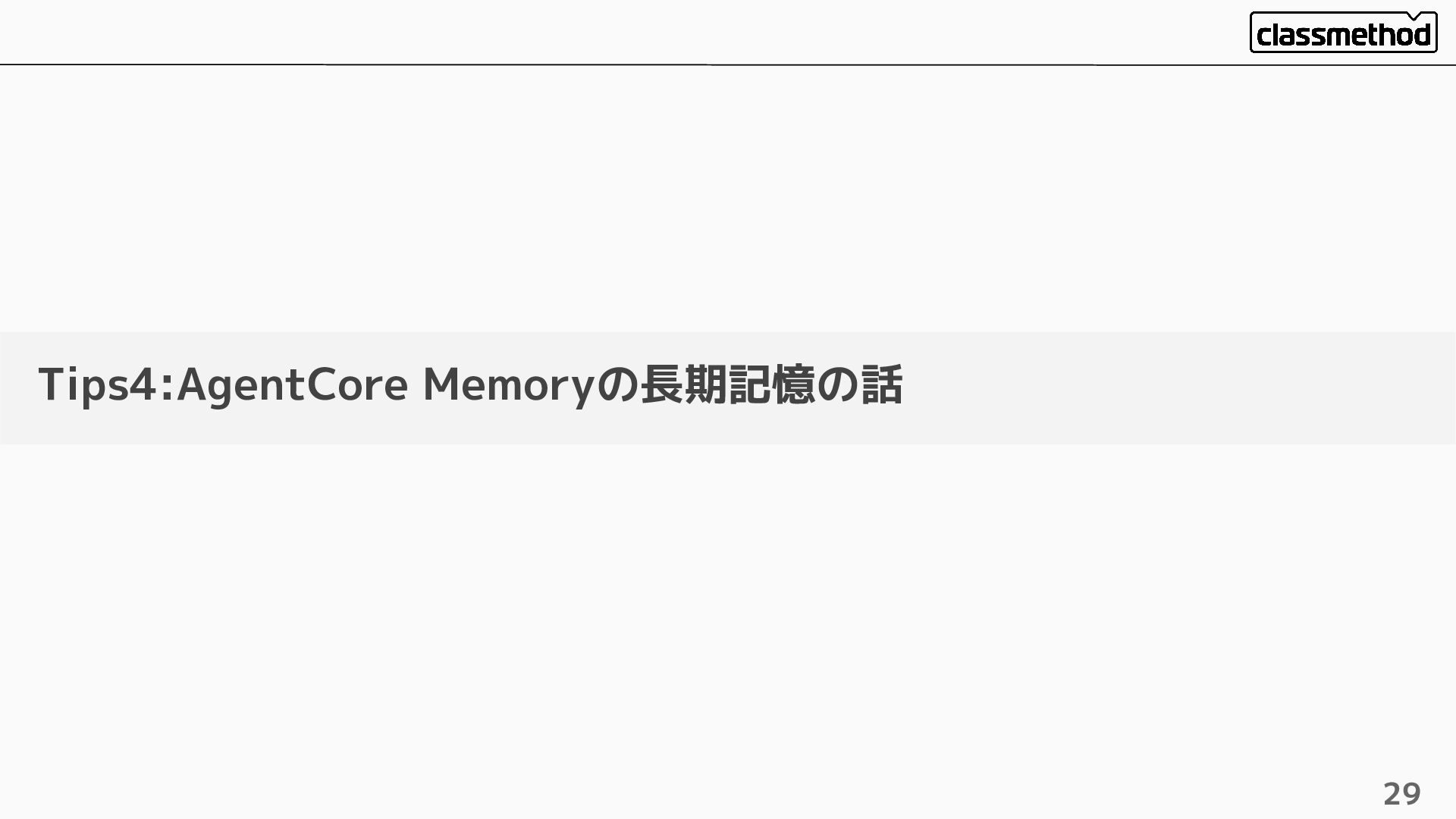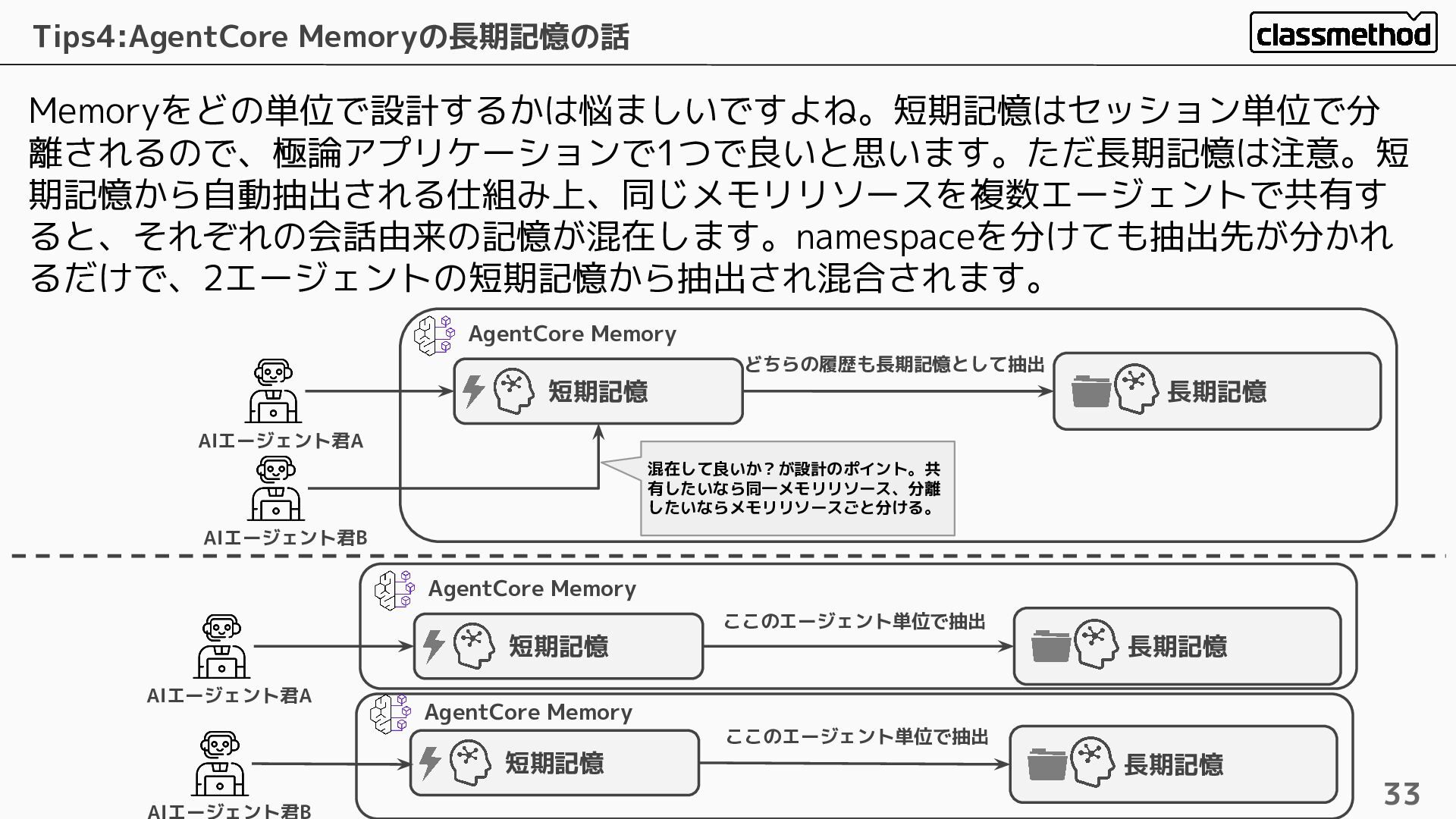 7. Memoryをどの単位で設計するかは悩ましいですよね。短期記憶はセッション単位で分 離されるので、極論アプリケーションで1つで良いと思います。ただ長期記憶は注意。短 期記憶から自動抽出される仕組み上、同じメモリリソースを複数エージェントで共有す ると、それぞれの会話由来の記憶が混在します。namespaceを分けても抽出先が分かれ るだけで、2エージェントの短期記憶から抽出され混合されます。 Tips4:AgentCore Memoryの長期記憶の話 33 長期記憶 短期記憶