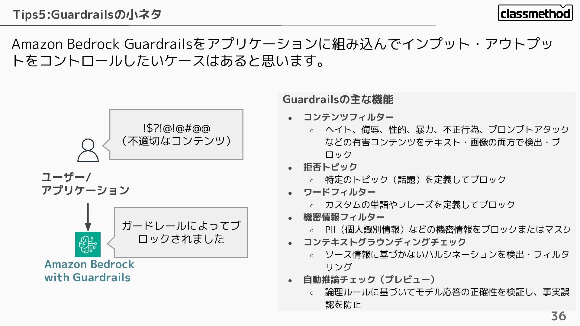 8. Amazon Bedrock Guardrailsをアプリケーションに組み込んでインプット・アウトプッ トをコントロールしたいケースはあると思います。 Tips5:Guardrailsの小ネタ 36 Amazon Bedrock with Guardrails