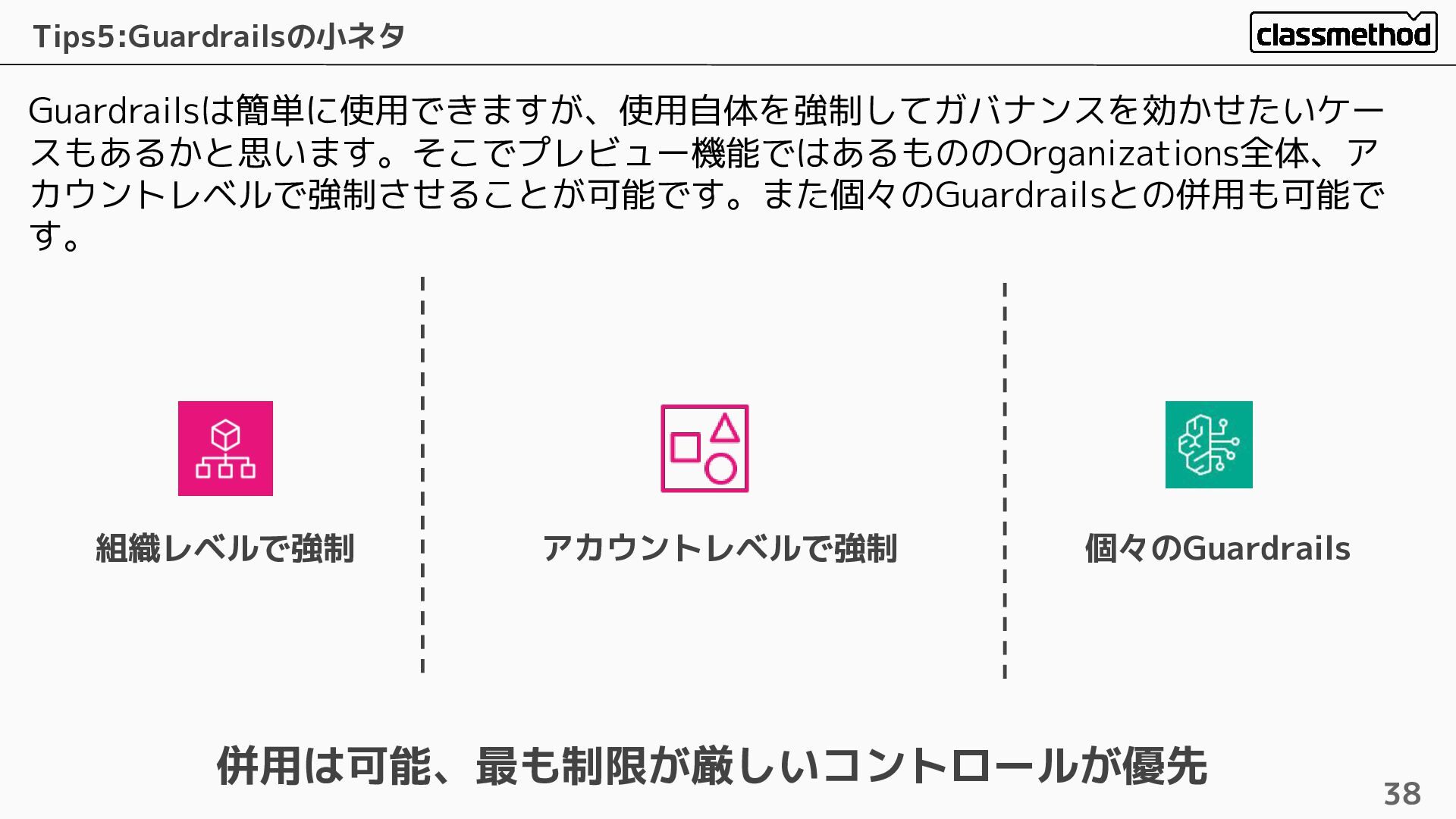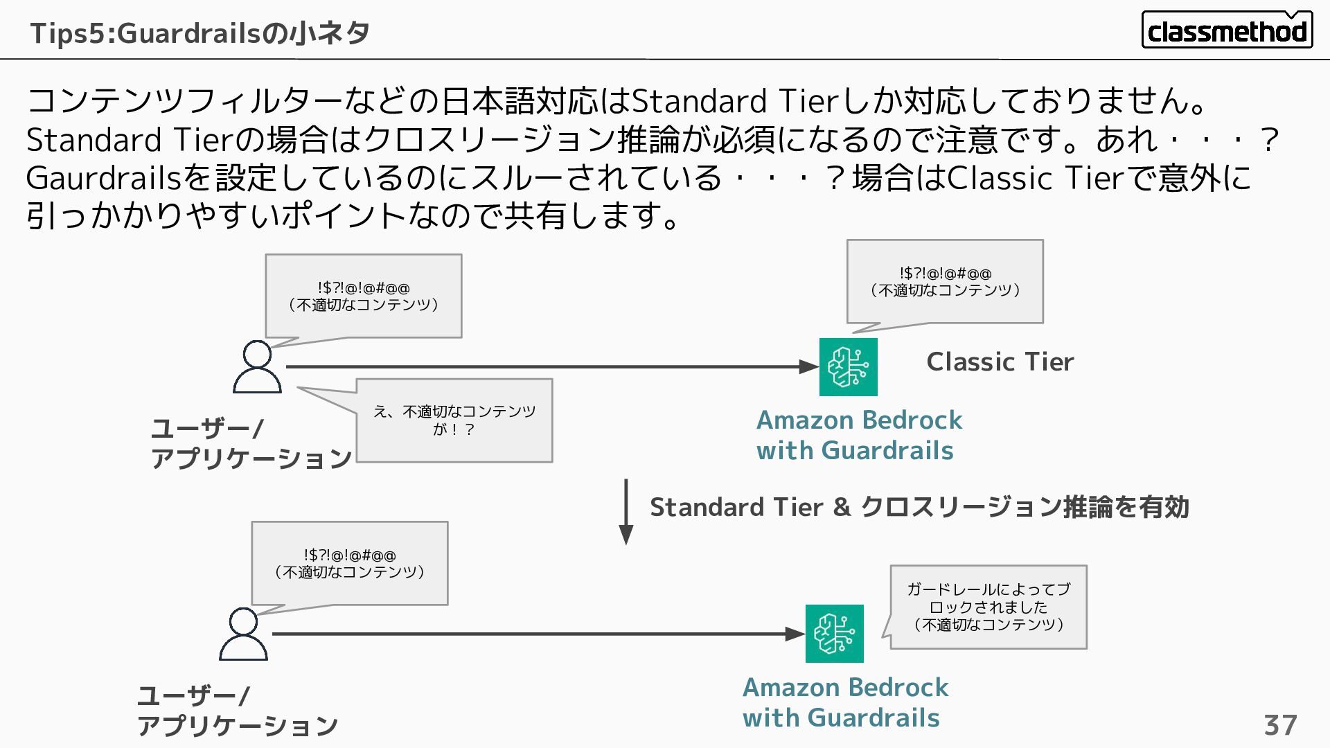 9. コンテンツフィルターなどの日本語対応はStandard Tierしか対応しておりません。 Standard Tierの場合はクロスリージョン推論が必須になるので注意です。あれ・・・? Gaurdrailsを設定しているのにスルーされている・・・?場合はClassic Tierで意外に 引っかかりやすいポイントなので共有します。 Tips5:Guardrailsの小ネタ 37 Amazon