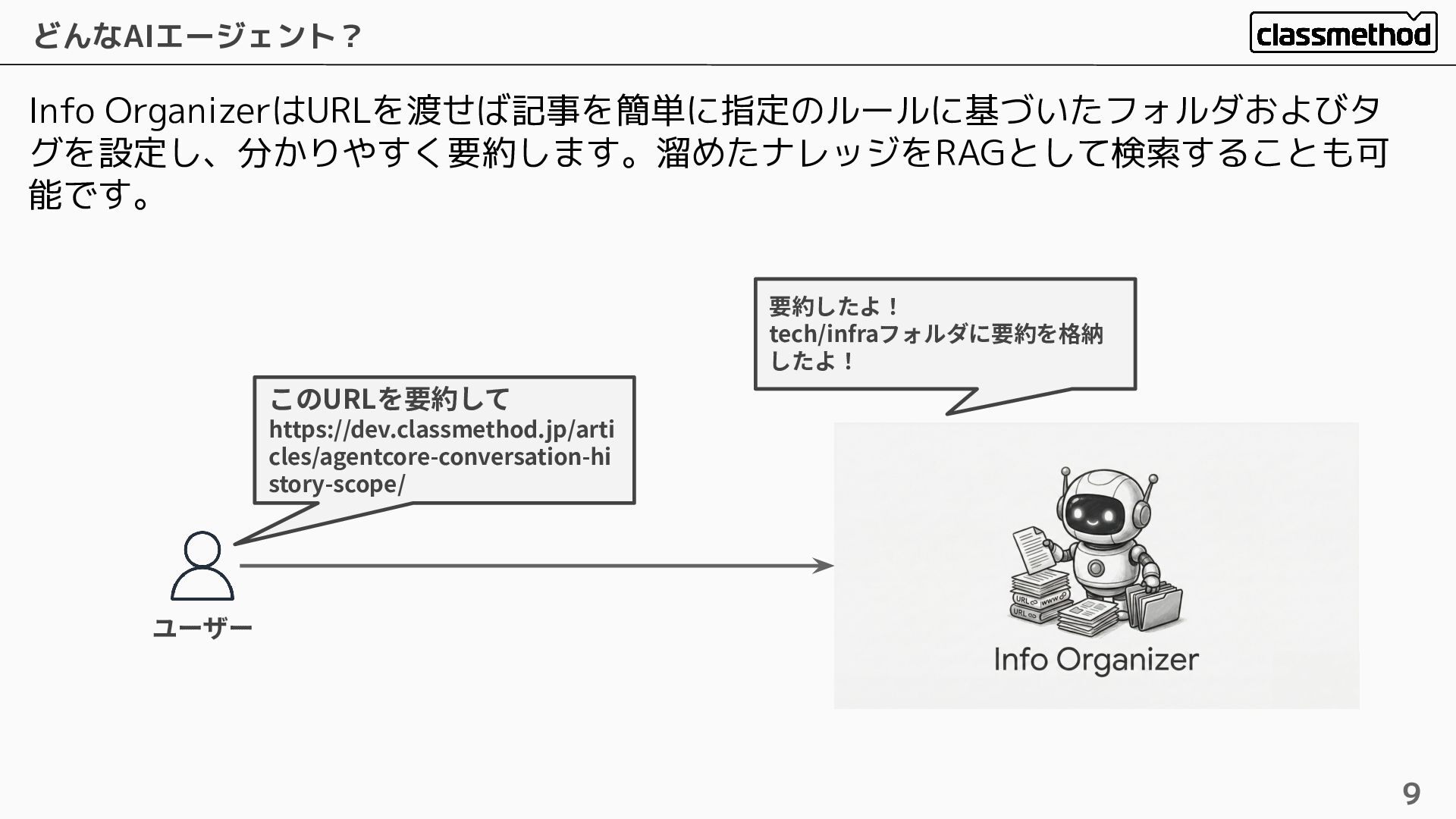 記事要約処理 ユーザー このURLを要約して このURLを要約して ユーザー このURLを要約して Knowledge Base S3 S3 Vectors 順次対応 ファイルアップロード 順次ベクトルDBに保存 同期 RAG AIエージェント 参照