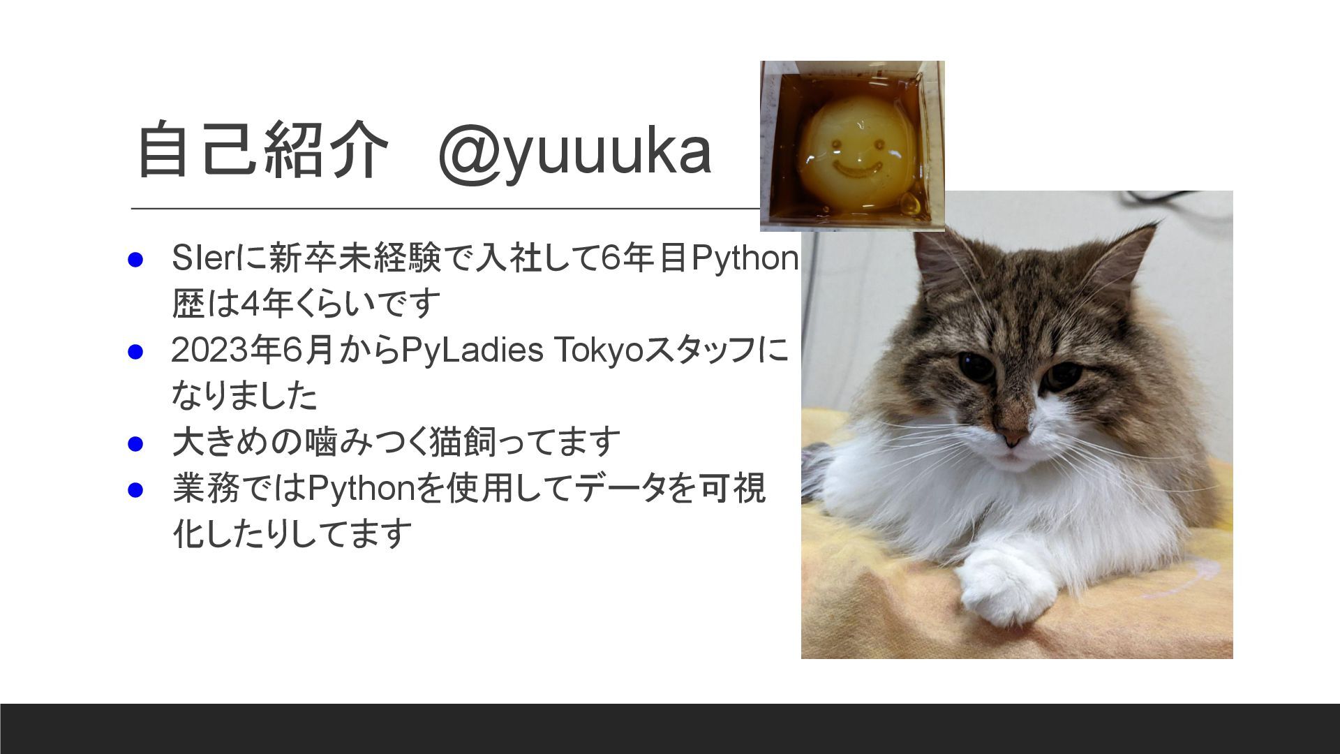 自己紹介 @yuuuka • SIerに新卒未経験で入社して6年目Python 歴は4年くらいです • 2023年6月からPyLadies Tokyoスタッフに なりました • 大きめの噛みつく猫飼ってます