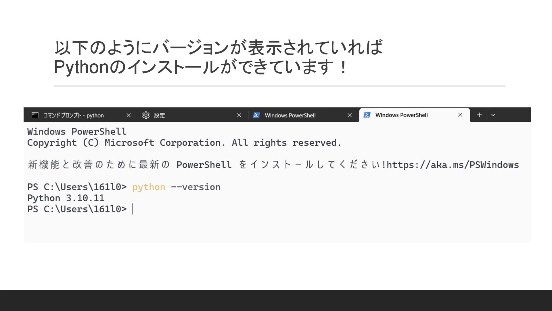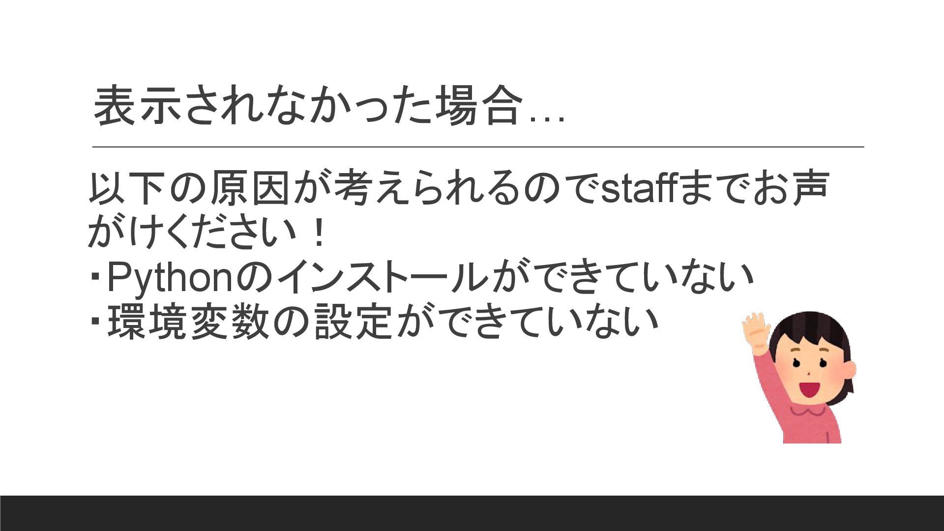 表示されなかった場合… 以下の原因が考えられるのでstaffまでお声 がけください! ・Pythonのインストールができていない ・環境変数の設定ができていない