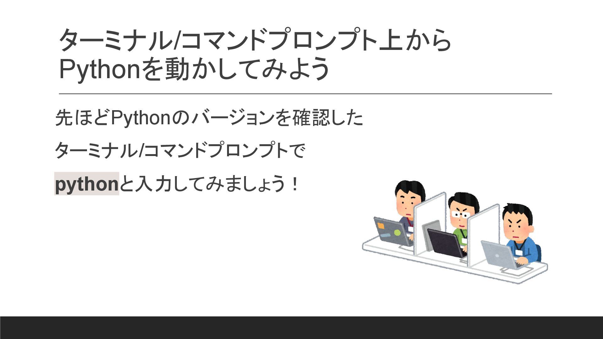 ターミナル/コマンドプロンプト上から Pythonを動かしてみよう 先ほどPythonのバージョンを確認した ターミナル/コマンドプロンプトで pythonと入力してみましょう!