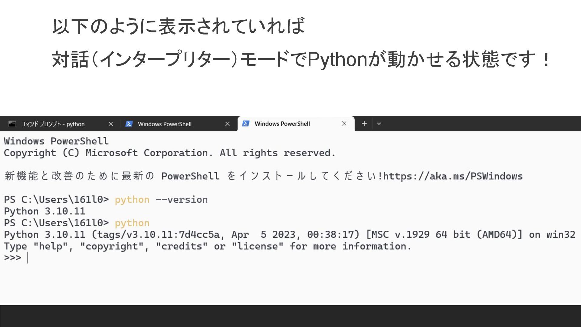 以下のように表示されていれば 対話(インタープリター)モードでPythonが動かせる状態です!