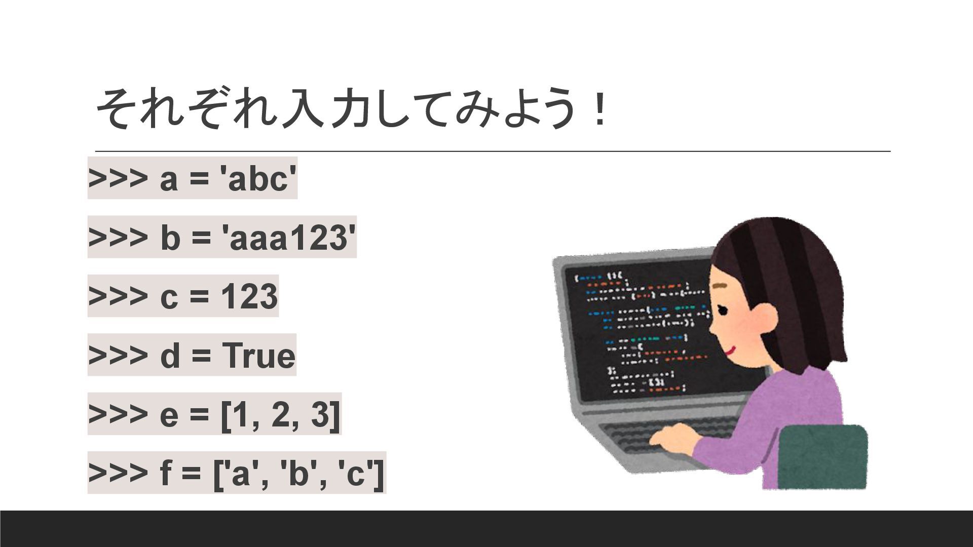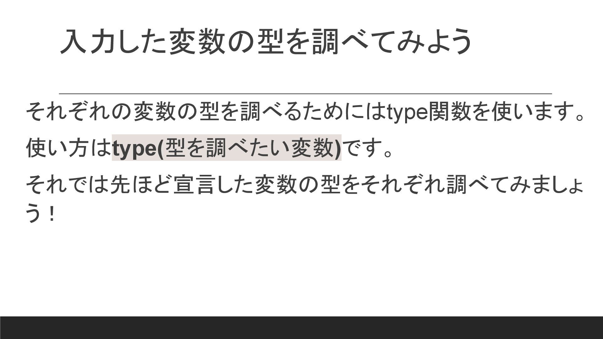 入力した変数の型を調べてみよう それぞれの変数の型を調べるためにはtype関数を使います。 使い方はtype(型を調べたい変数)です。 それでは先ほど宣言した変数の型をそれぞれ調べてみましょ う!