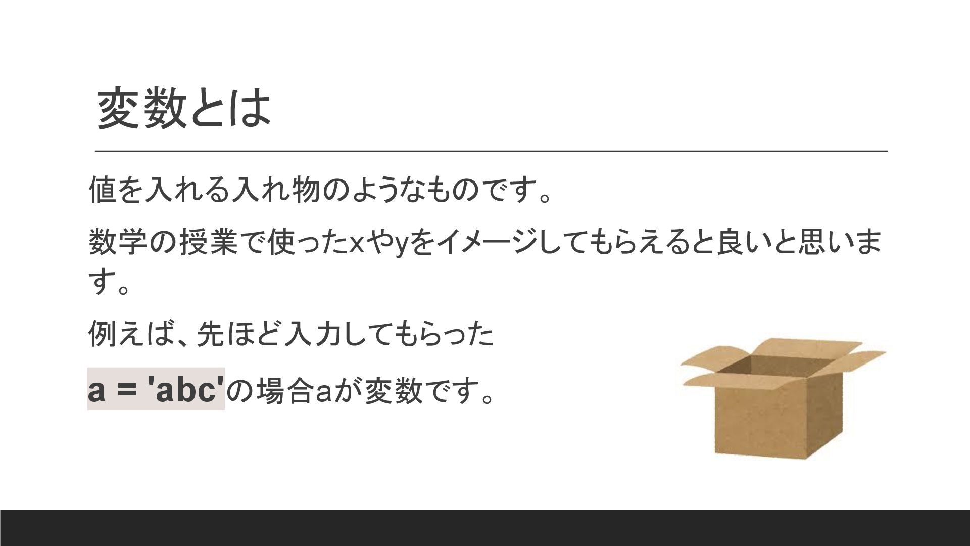 変数とは 値を入れる入れ物のようなものです。 数学の授業で使ったxやyをイメージしてもらえると良いと思いま す。 例えば、先ほど入力してもらった a = 'abc'の場合aが変数です。