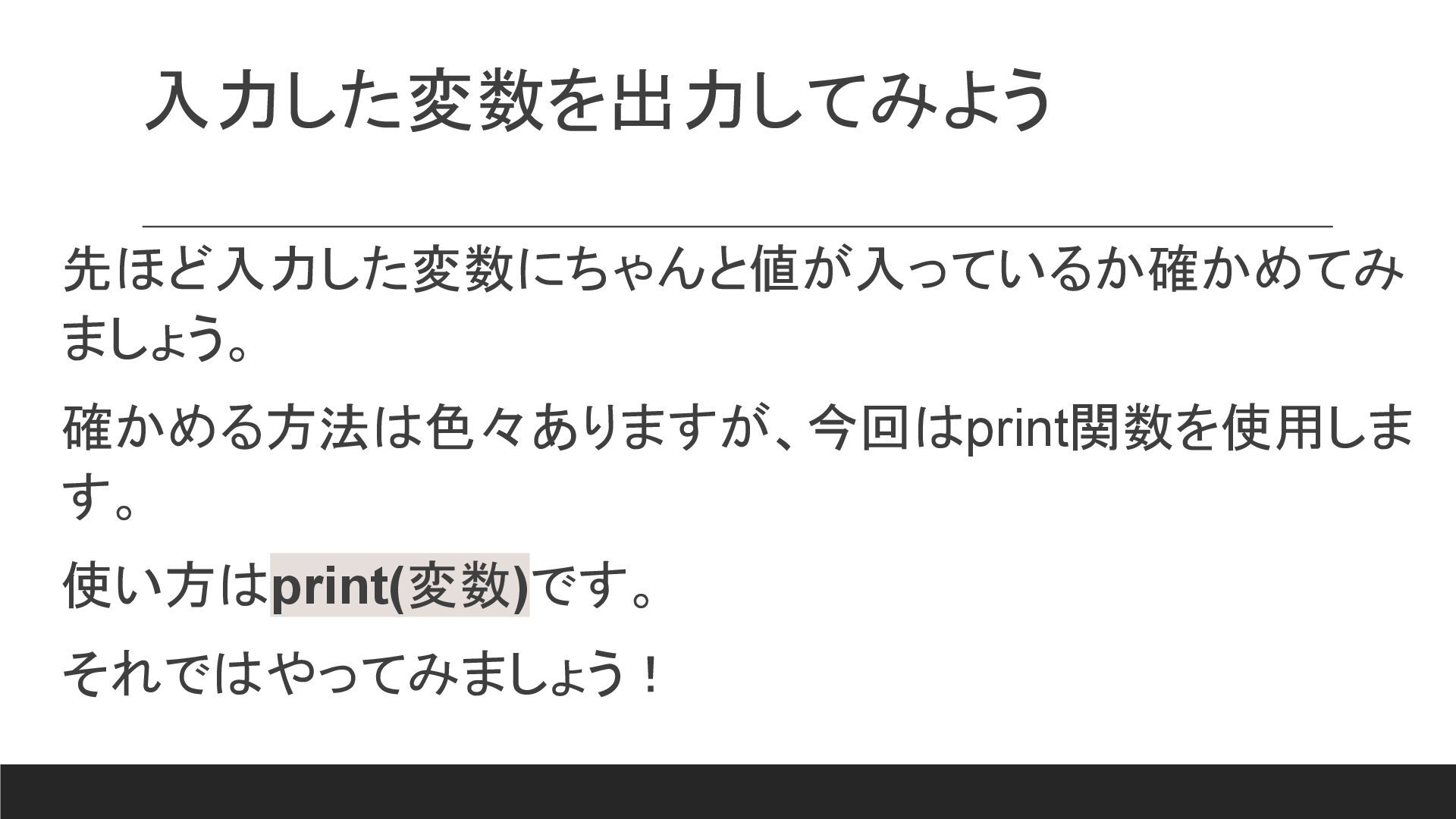 入力した変数を出力してみよう 先ほど入力した変数にちゃんと値が入っているか確かめてみ ましょう。 確かめる方法は色々ありますが、今回はprint関数を使用しま す。 使い方はprint(変数)です。 それではやってみましょう!