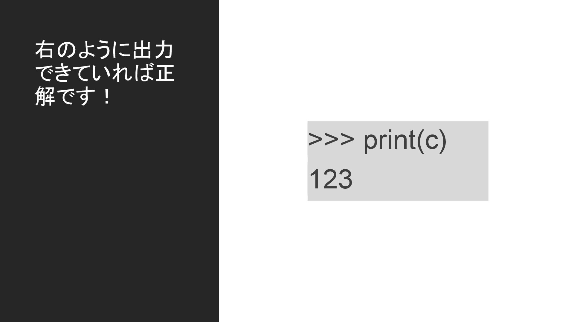 右のように出力 できていれば正 解です! >>> print(c) 123
