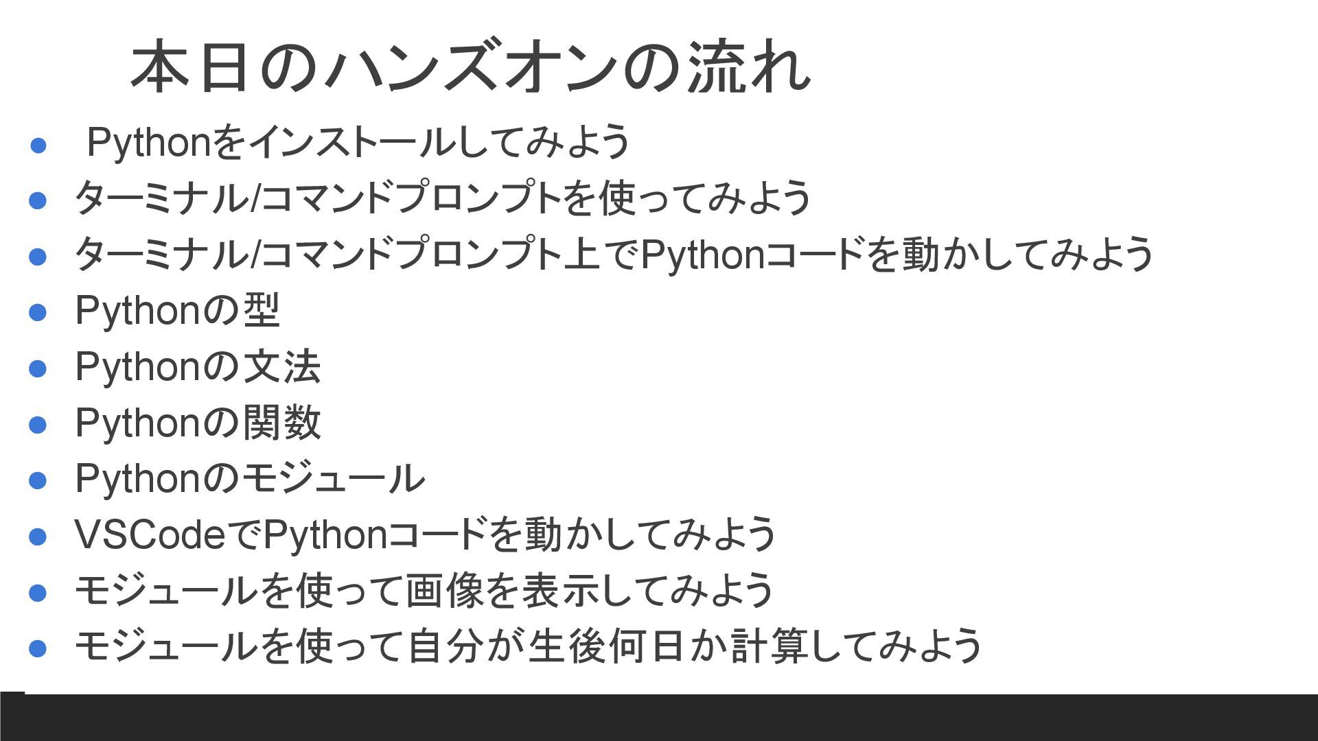 本日のハンズオンの流れ • Pythonをインストールしてみよう • ターミナル/コマンドプロンプトを使ってみよう • ターミナル/コマンドプロンプト上でPythonコードを動かしてみよう • Pythonの型 •