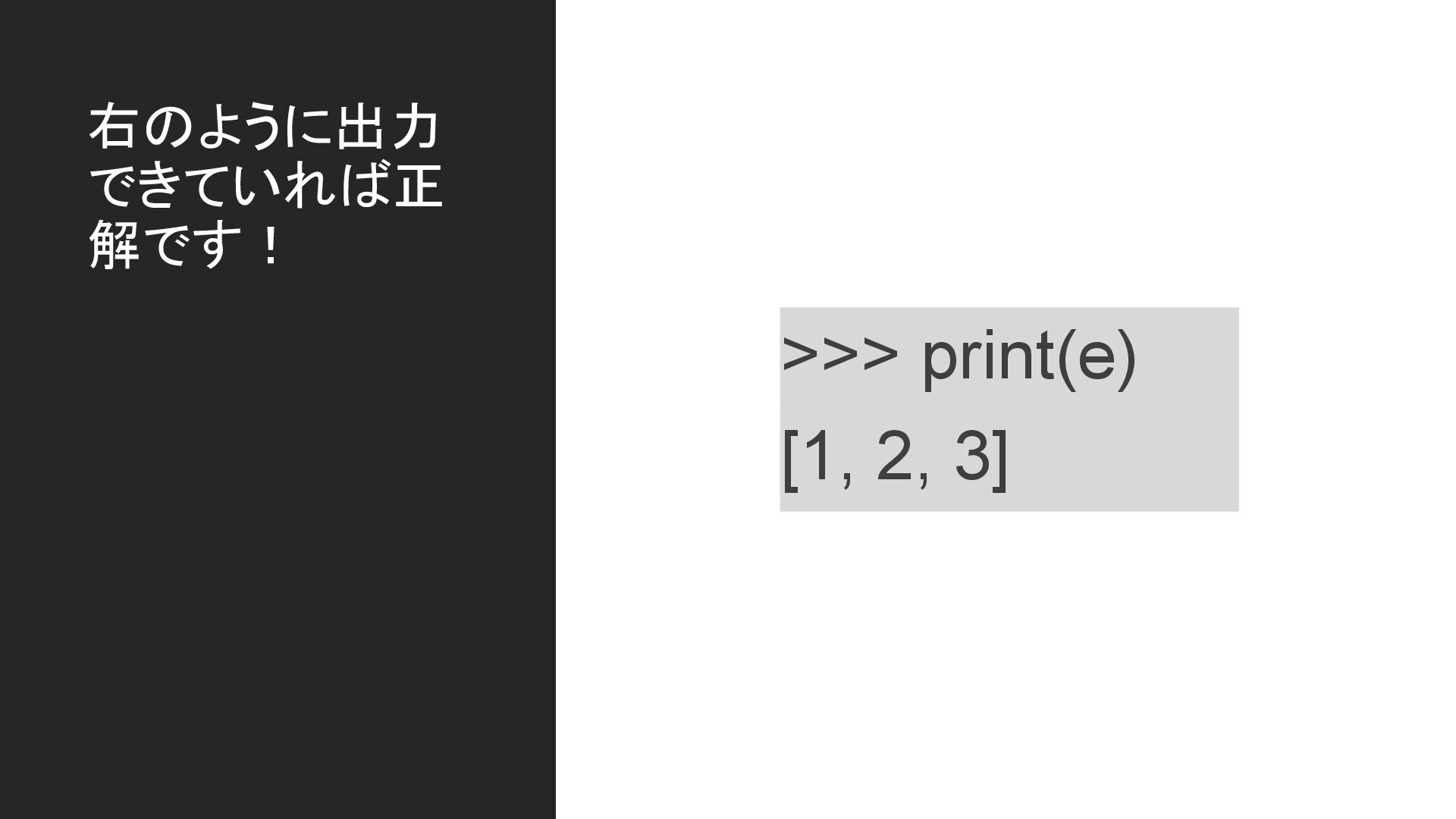 右のように出力 できていれば正 解です! >>> print(e) [1, 2, 3]
