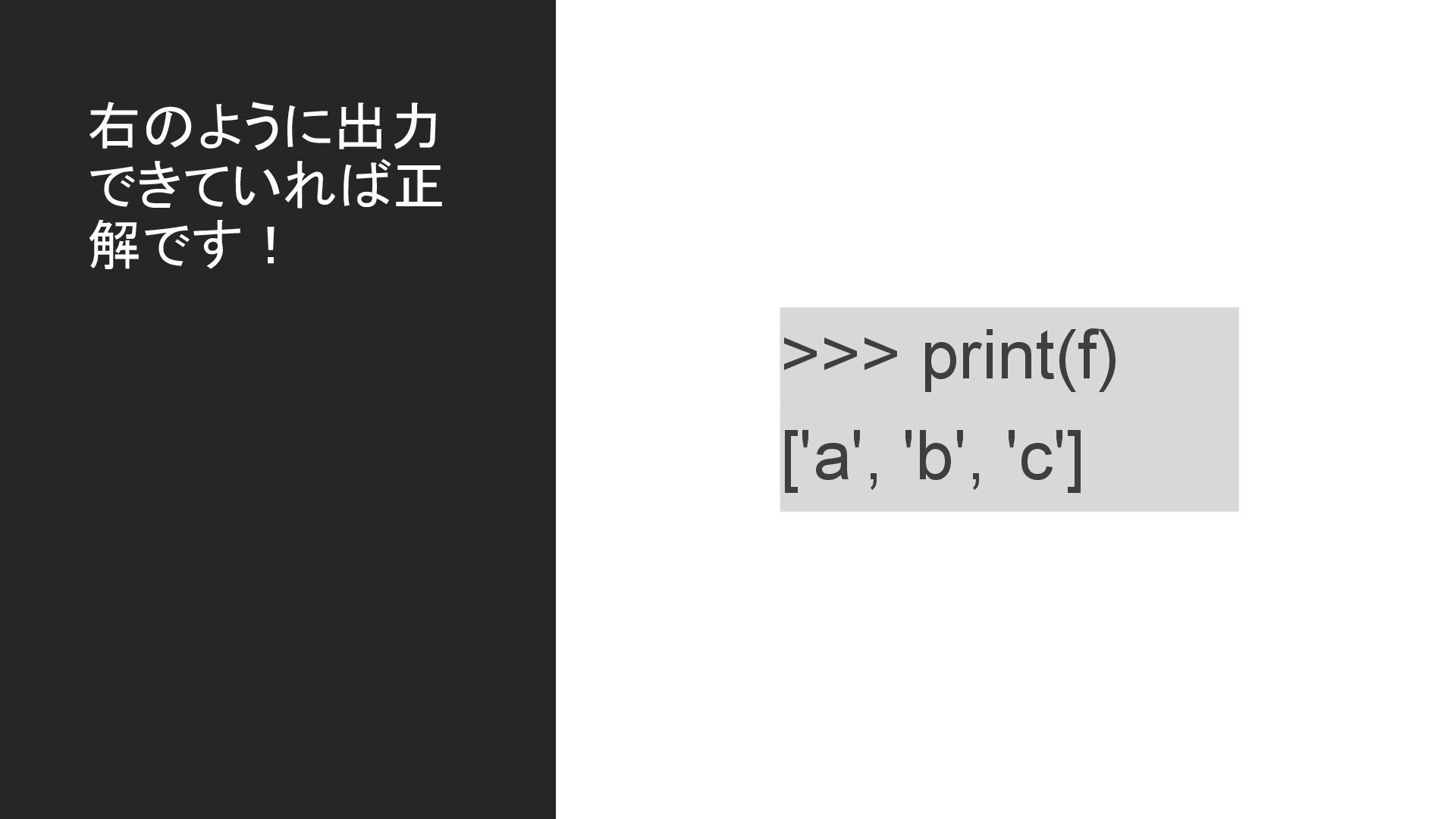 右のように出力 できていれば正 解です! >>> print(f) ['a', 'b', 'c']