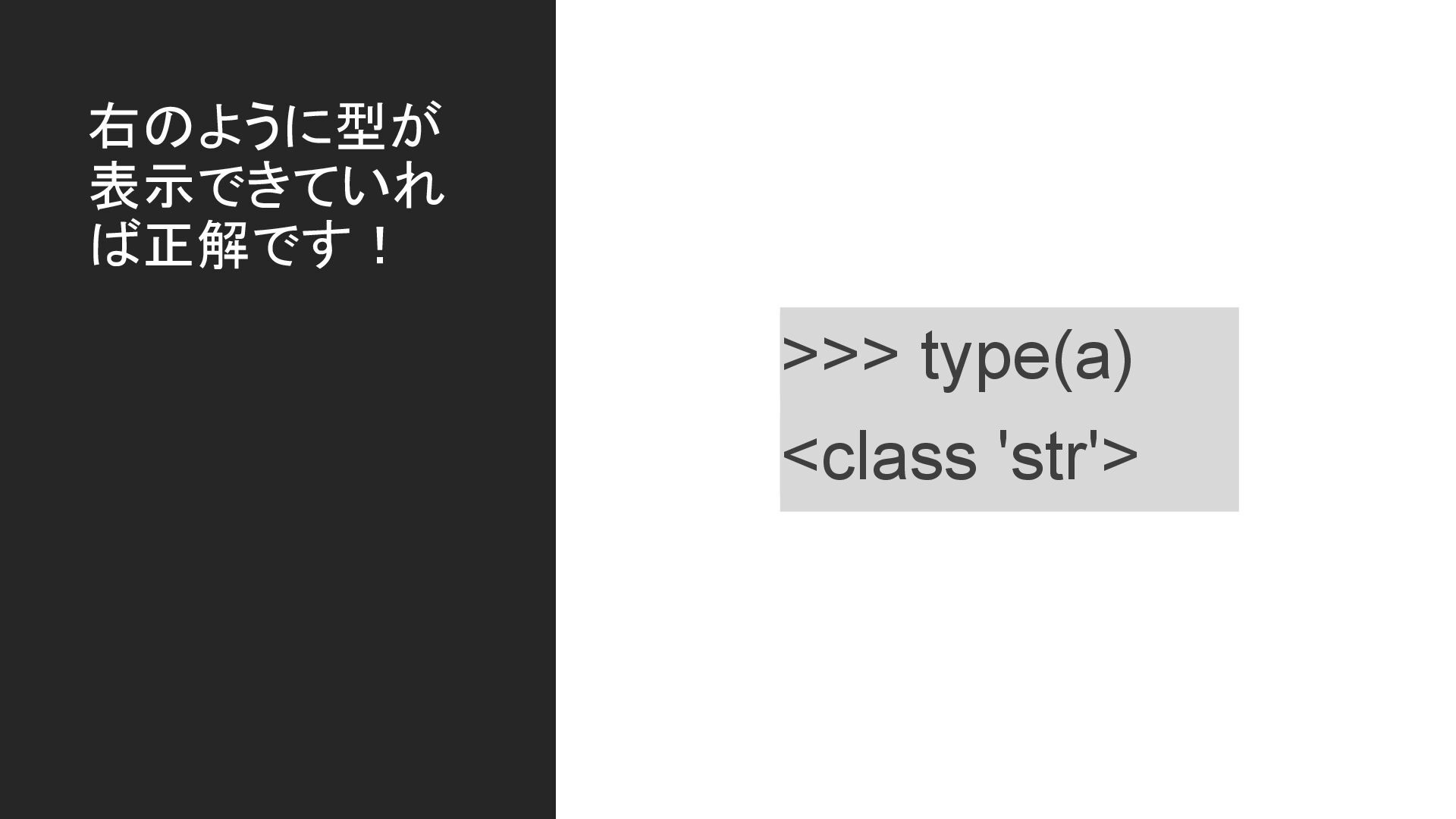 右のように型が 表示できていれ ば正解です! >>> type(a) <class 'str'>