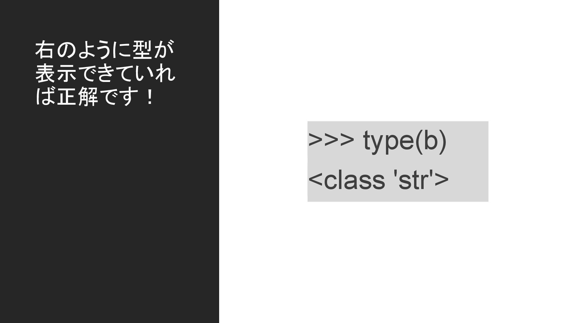 右のように型が 表示できていれ ば正解です! >>> type(b) <class 'str'>