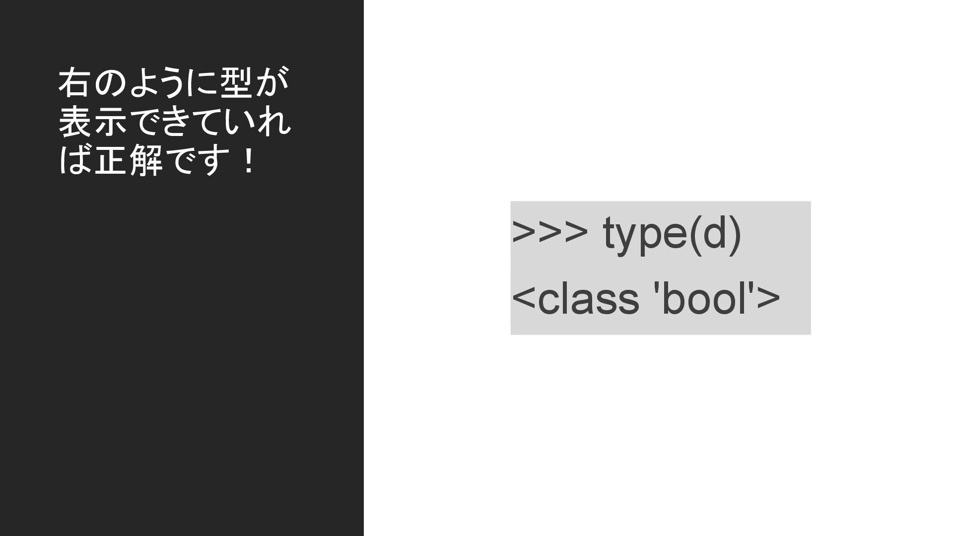右のように型が 表示できていれ ば正解です! >>> type(d) <class 'bool'>