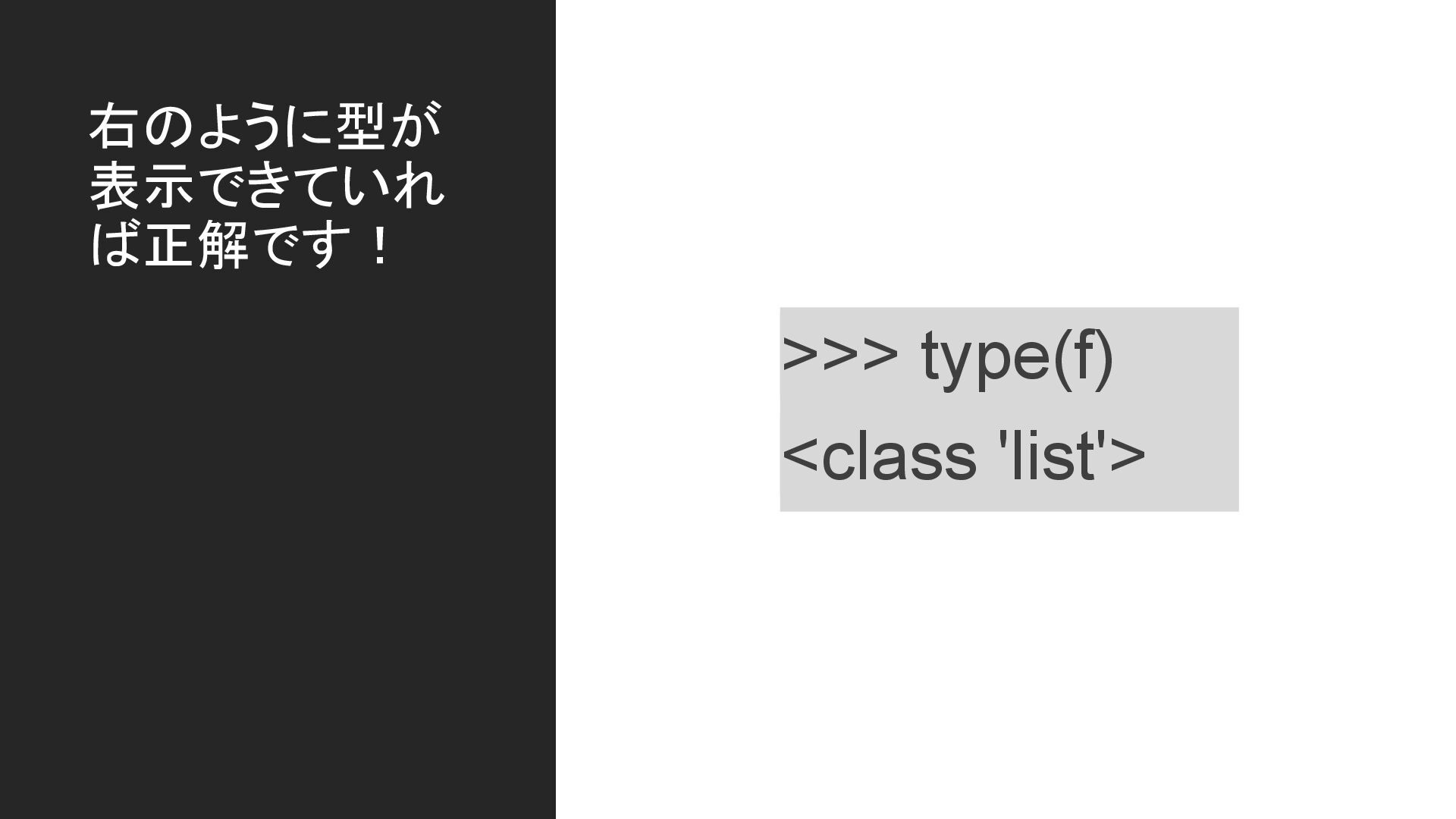 右のように型が 表示できていれ ば正解です! >>> type(f) <class 'list'>