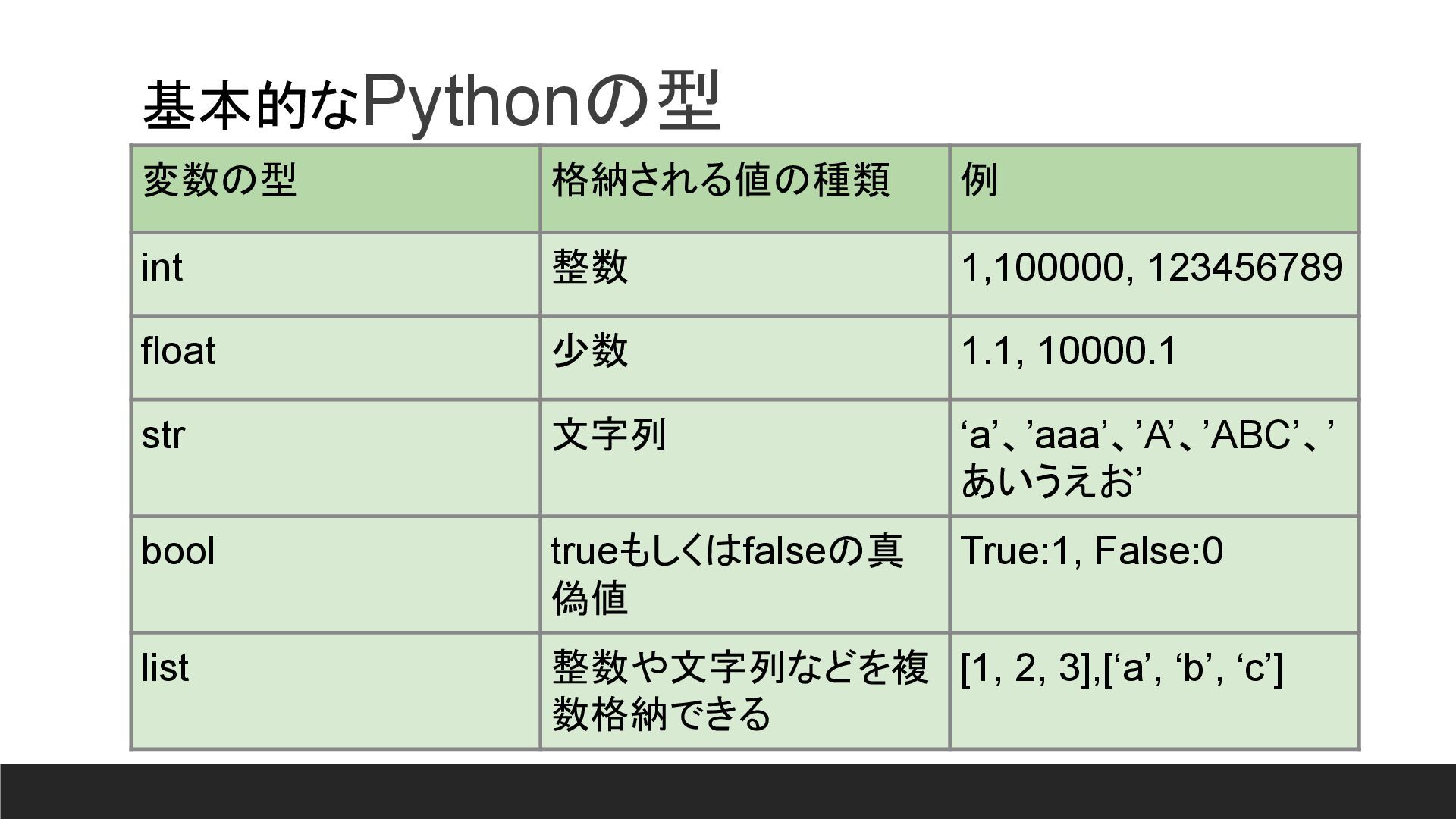 1.1, 10000.1 str 文字列 ‘a’、’aaa’、’A’、’ABC’、’ あいうえお’ bool trueもしくはfalseの真 偽値 True:1, False:0 list 整数や文字列などを複 数格納できる [1, 2, 3],[‘a’, ‘b’, ‘c’]