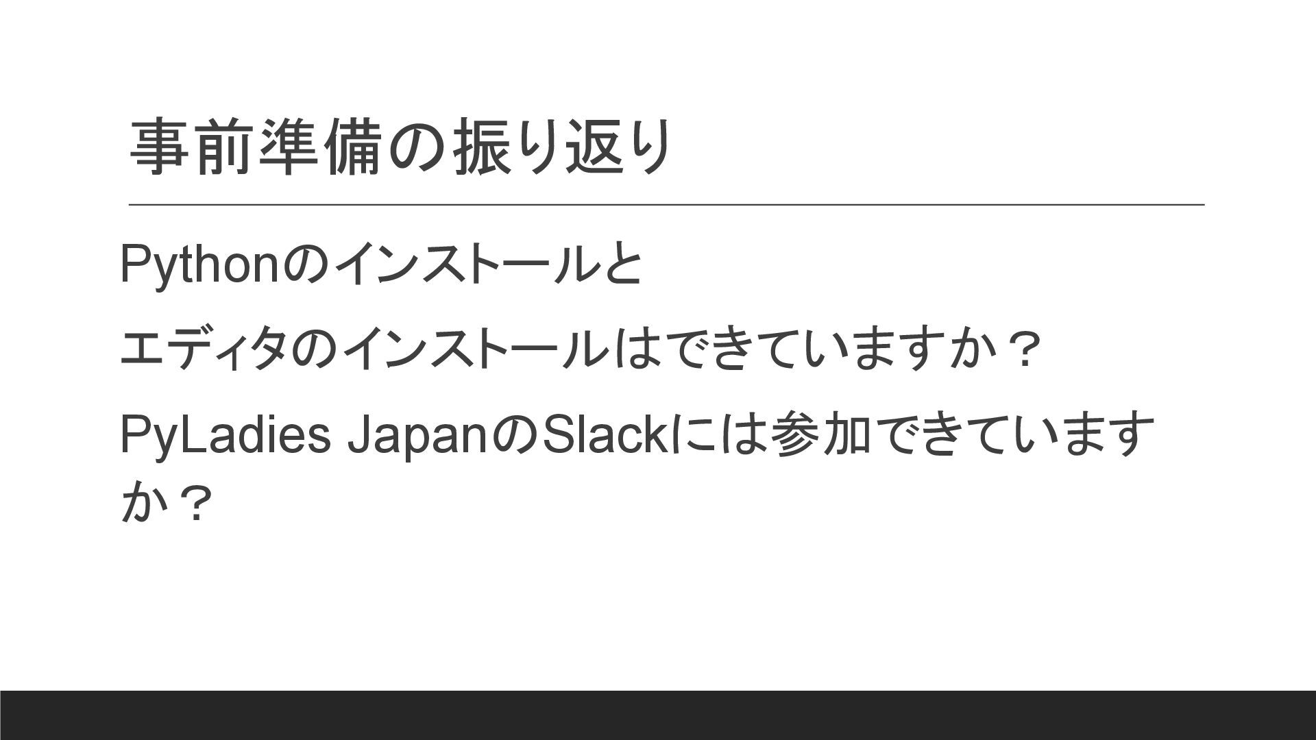 事前準備の振り返り Pythonのインストールと エディタのインストールはできていますか? PyLadies JapanのSlackには参加できています か?
