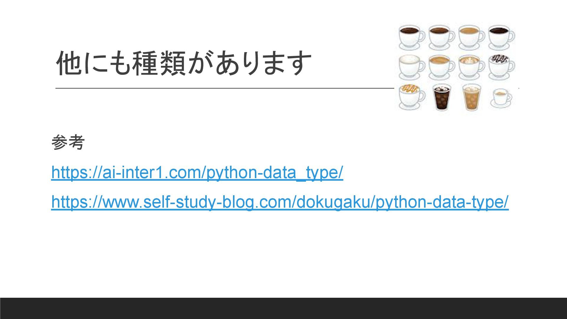 他にも種類があります 参考 https://ai-inter1.com/python-data_type/ https://www.self-study-blog.com/dokugaku/python-data-type/