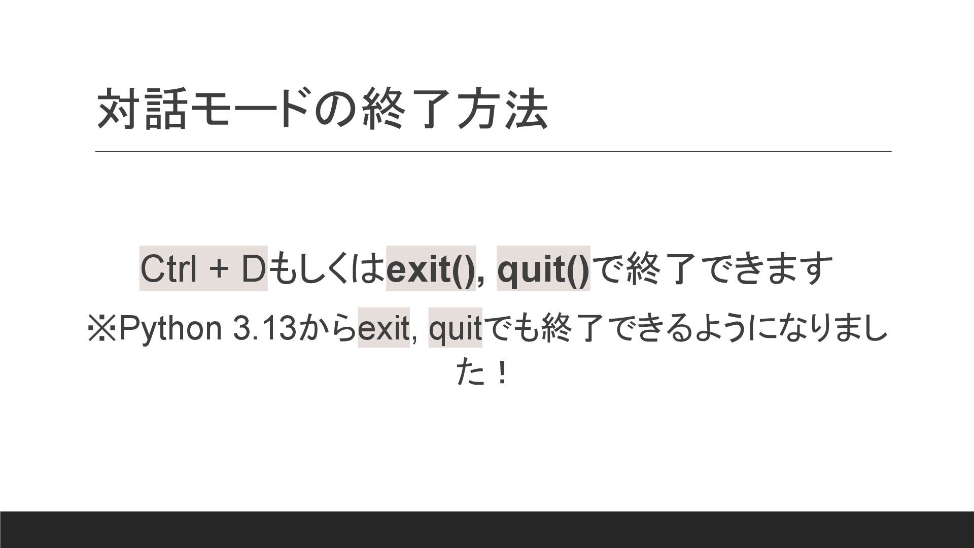 対話モードの終了方法 Ctrl + Dもしくはexit(), quit()で終了できます ※Python 3.13からexit, quitでも終了できるようになりまし た!
