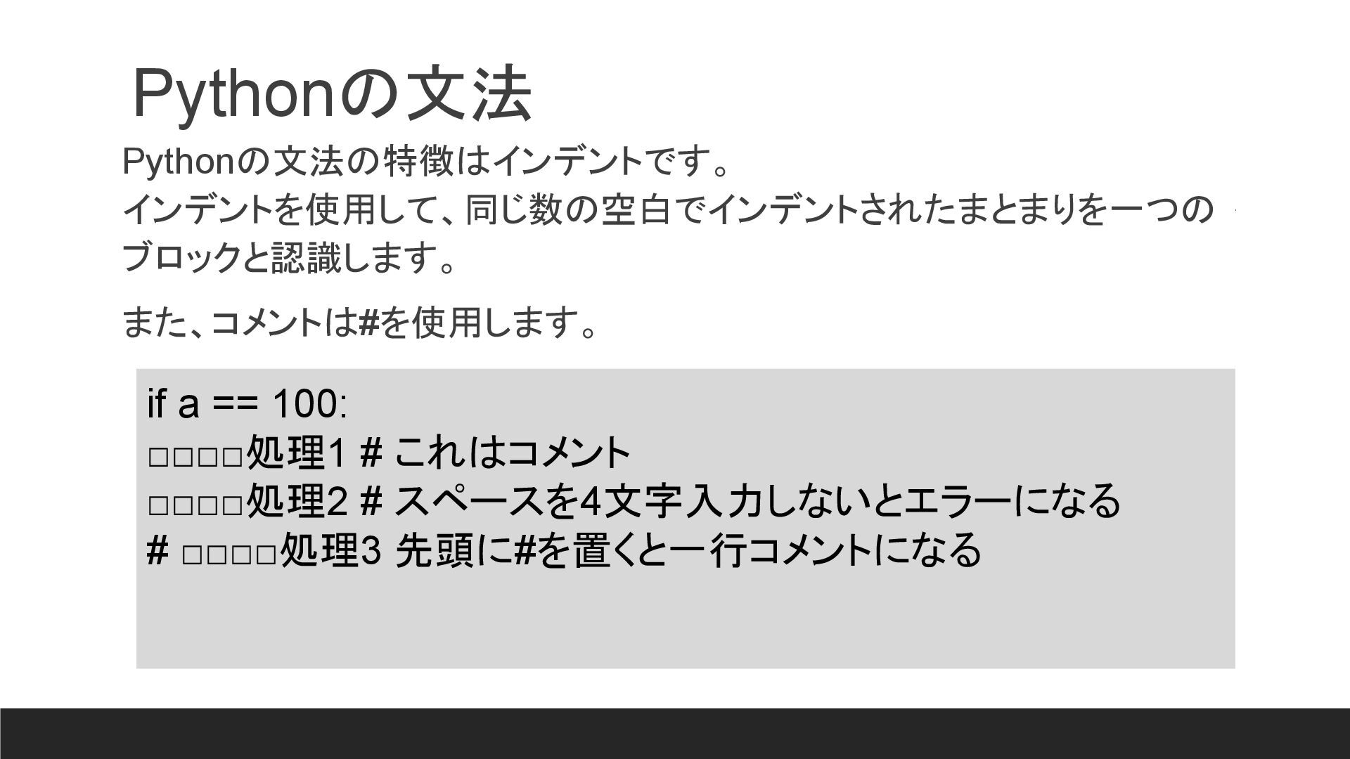 Pythonの文法 Pythonの文法の特徴はインデントです。 インデントを使用して、同じ数の空白でインデントされたまとまりを一つの ブロックと認識します。 また、コメントは#を使用します。 if a == 100: □□□□処理1