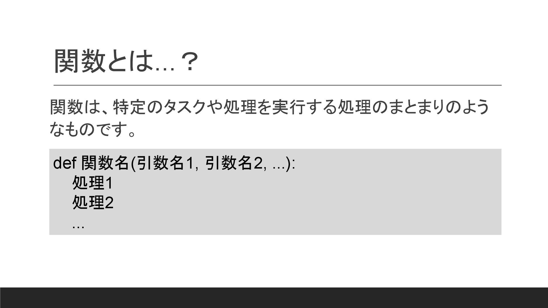 関数とは...? 関数は、特定のタスクや処理を実行する処理のまとまりのよう なものです。 def 関数名(引数名1, 引数名2, ...): 処理1 処理2 ...